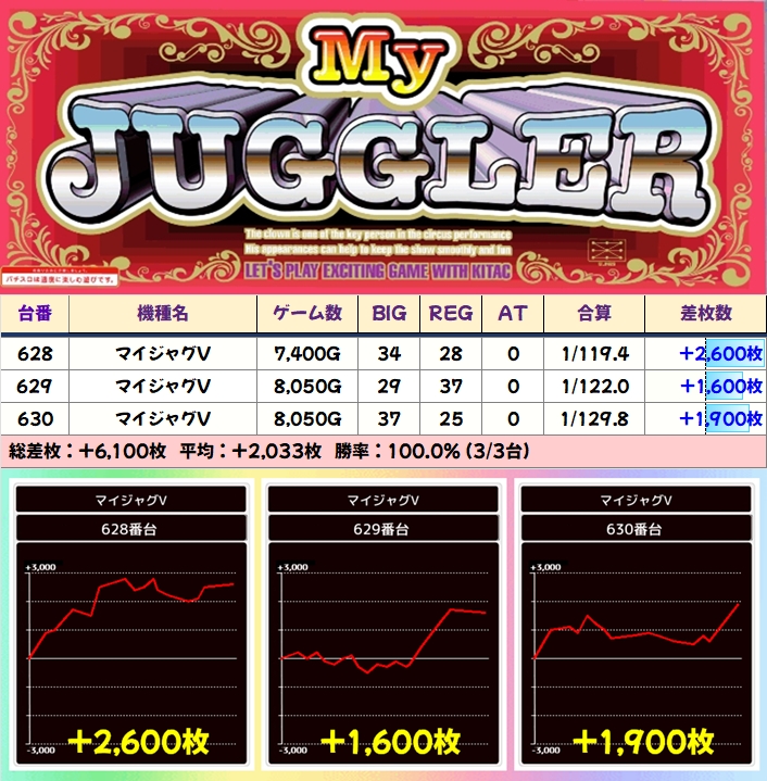 【3台並び】マイジャグラーV(628番台〜630番台)→平均+2,033枚(3/3台+)