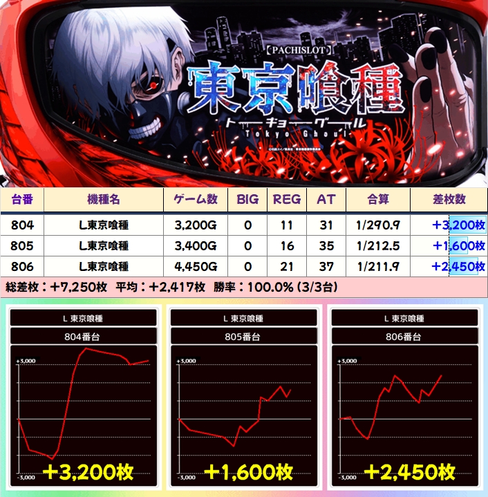【3台並び】東京喰種(804番台〜806番台)→平均+2,417枚(3/3台+)