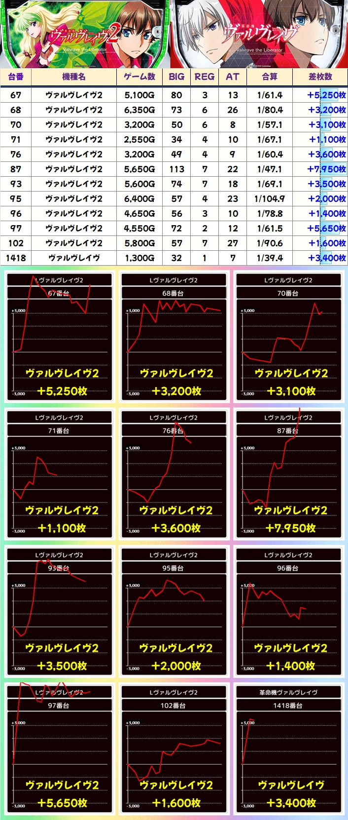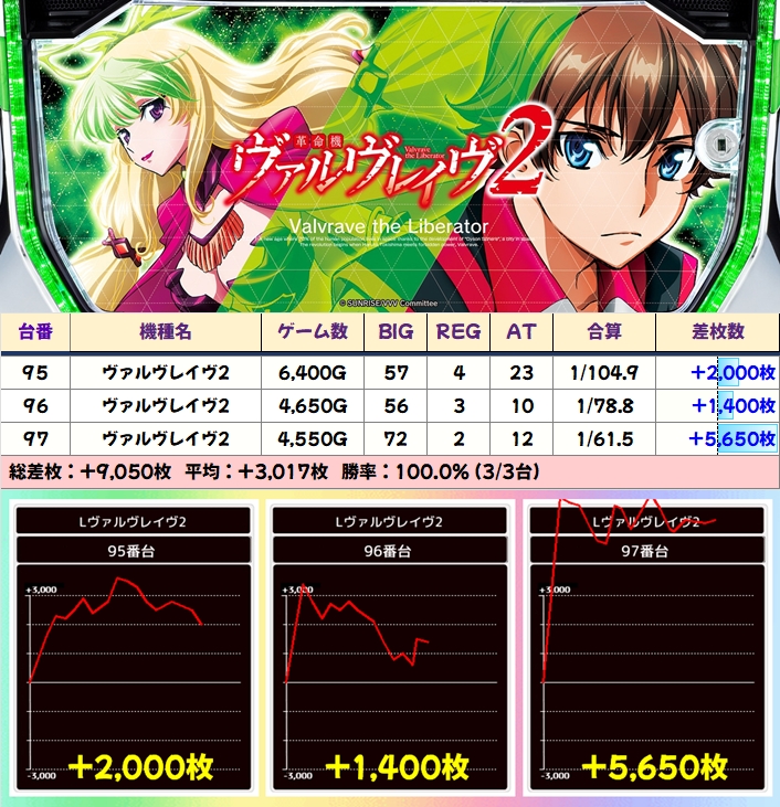 【3台並び】ヴァルヴレイヴ2(95番台〜97番台)→平均+3,017枚(3/3台+)