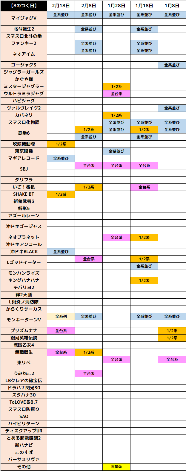 前回の8の日は山佐機種の「モンキーターンV」から列仕掛けを確認でき、前々回は山佐機種の「SBJ」と「ゴッドイーター」全台系濃厚に! また、山佐機種以外からも仕掛けを確認することができました。