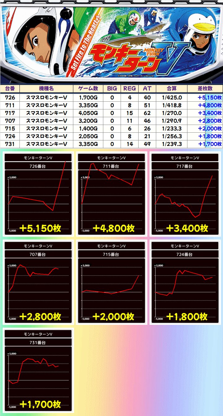 「モンキーV」は+5150枚を筆頭に計7台が+1000枚を突破!