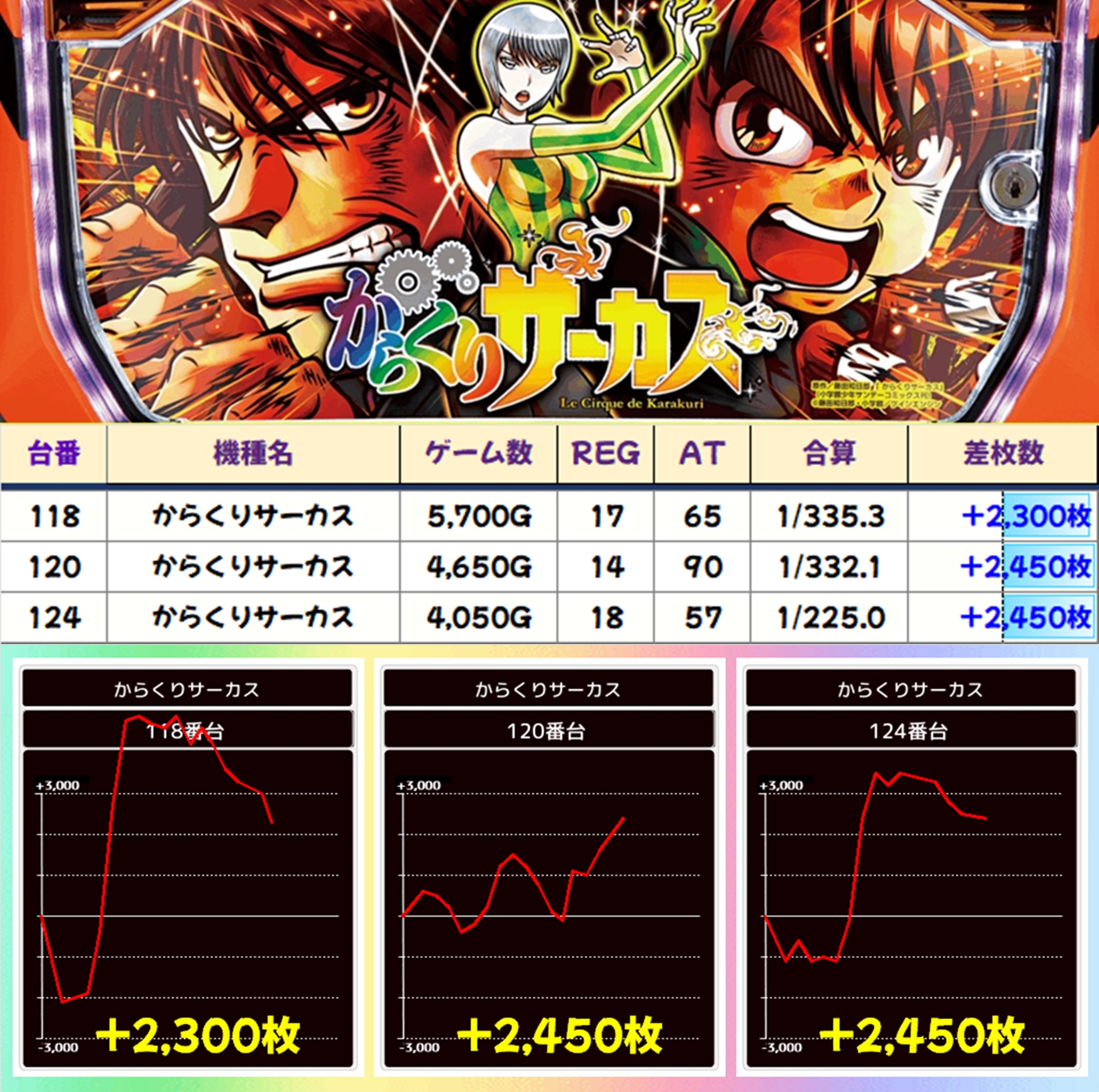 からくりサーカスからは3台の+2000枚オーバーの出玉アリ!