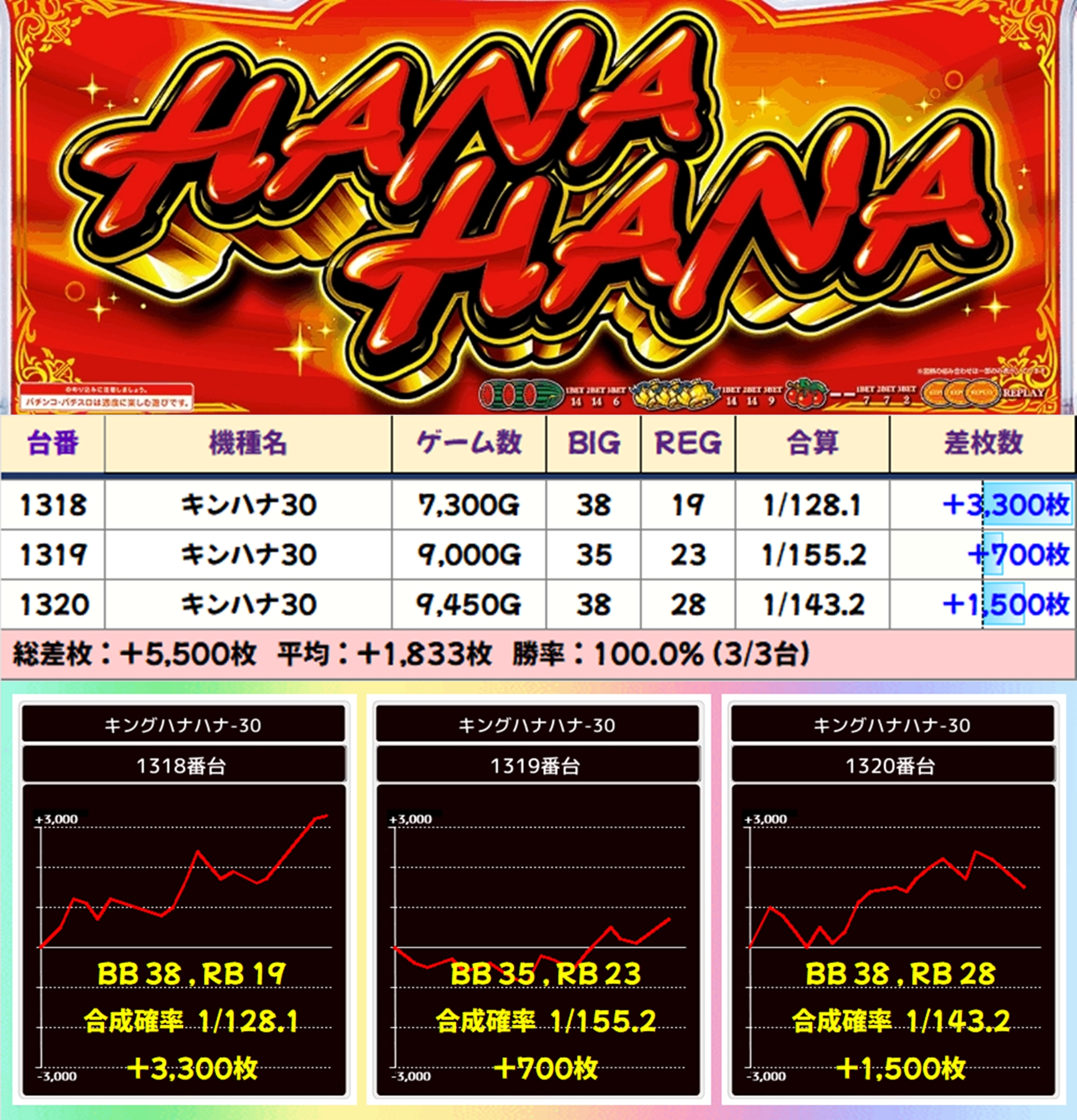 【3台並び】キンハナ30(1318-1320番台)→平均+1,833枚