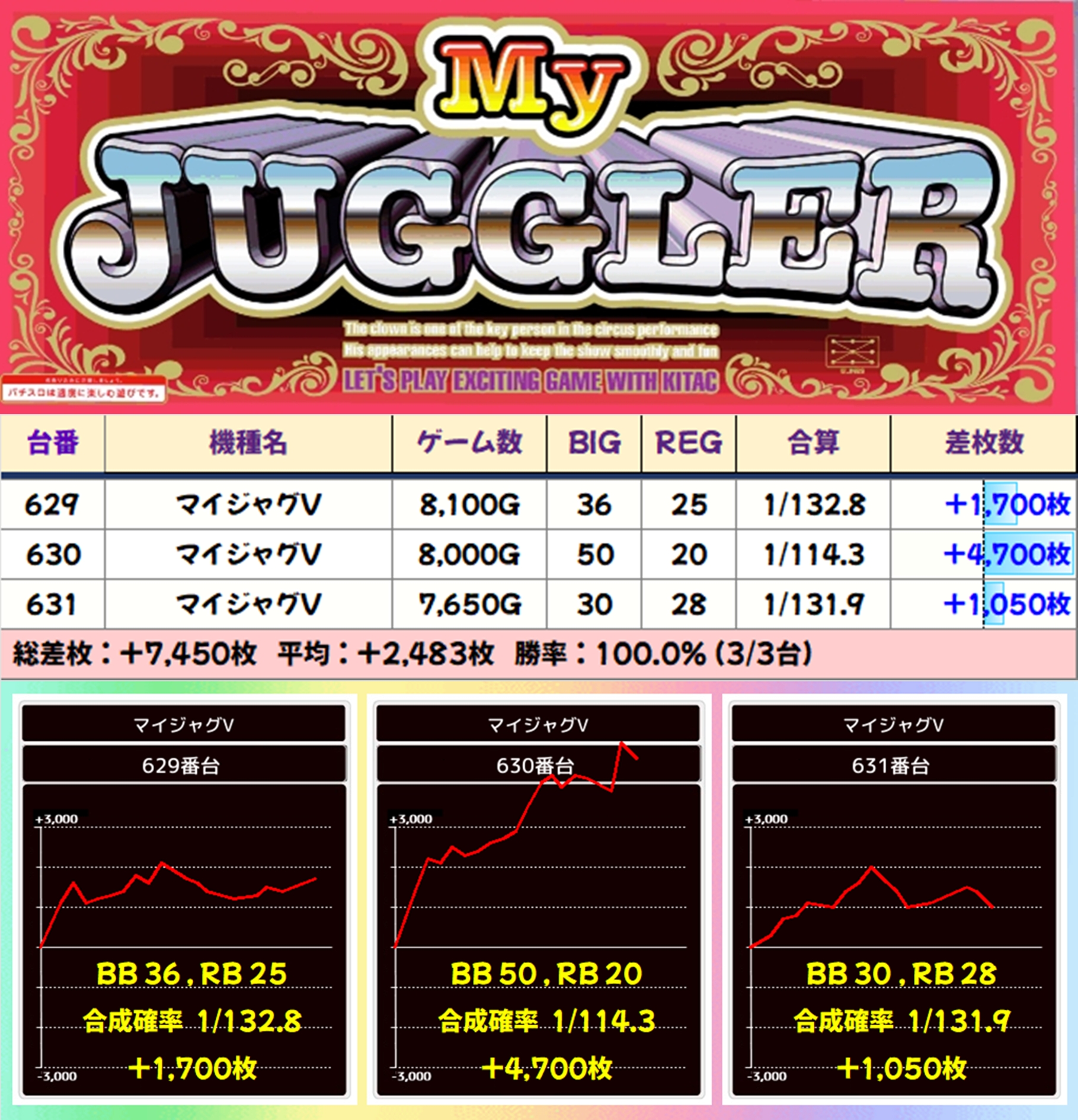 【3台並び】マイジャグV(629-631番台)→平均+2,483枚