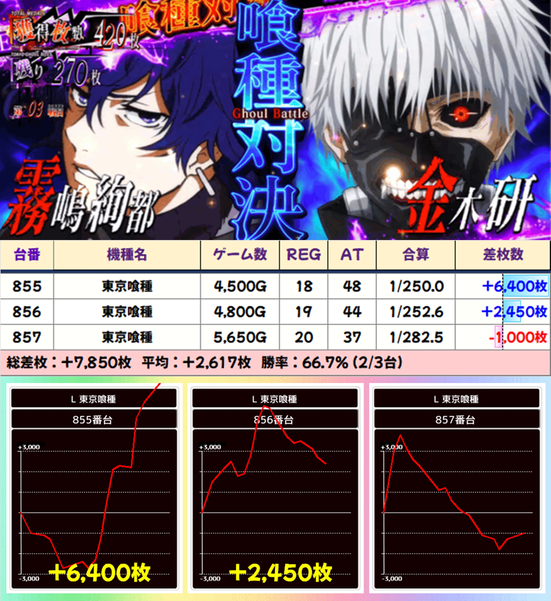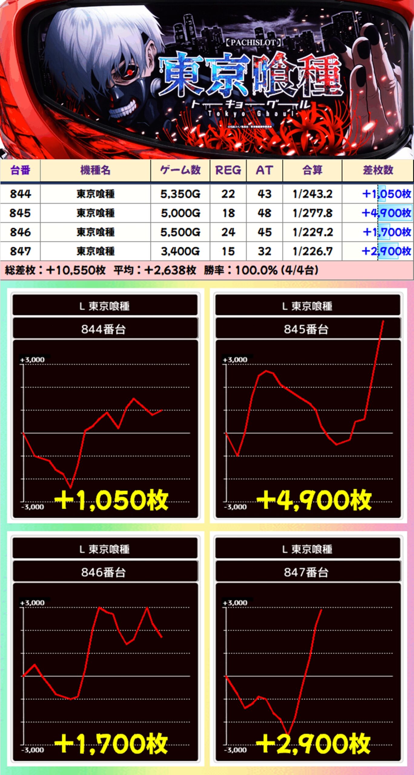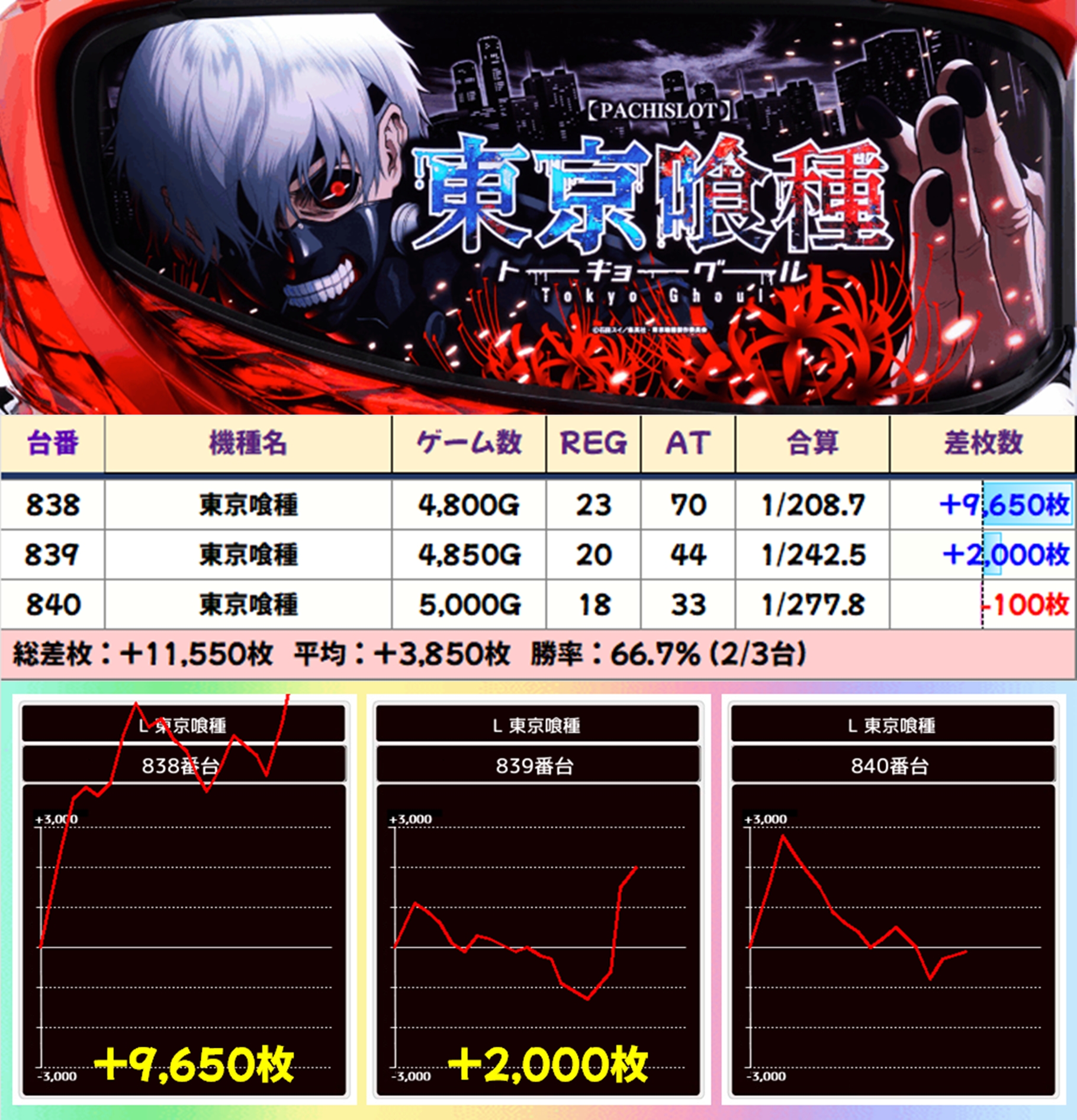 東京喰種からは+9650枚の爆発台も飛び出し、いずれの並びも好成績を残しておりました!
