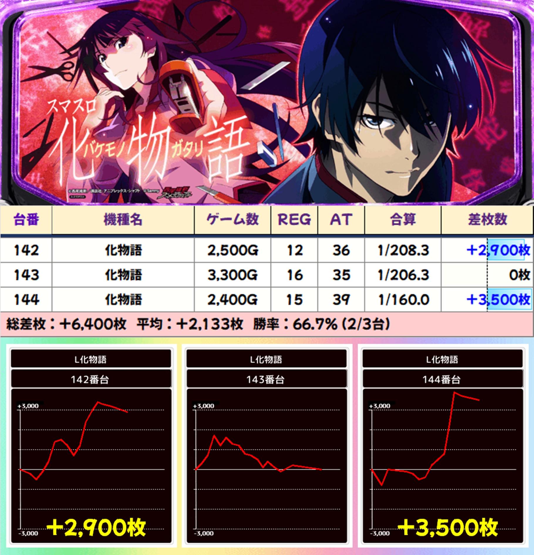 【3台並び】化物語(142-144番台)→平均+2,133枚
