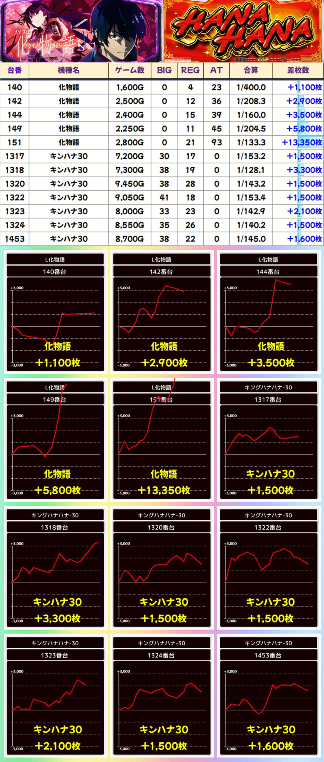 0のつく日にチャンスの30Φからキンハナ30に1/2系濃厚の仕掛けアリ!また、化物語にも仕掛けが出現し、+13350枚という見事な出玉も確認できました!