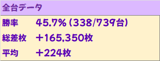 今回の6のつく日は総差枚+165350枚、平均+224枚と大幅なプラス差枚となりました。