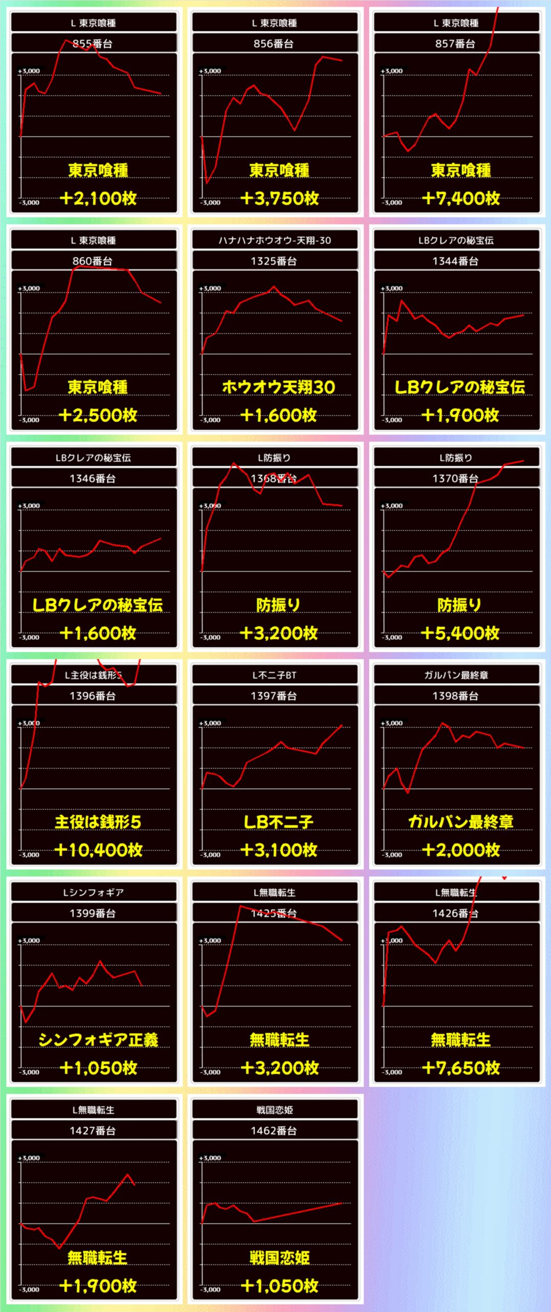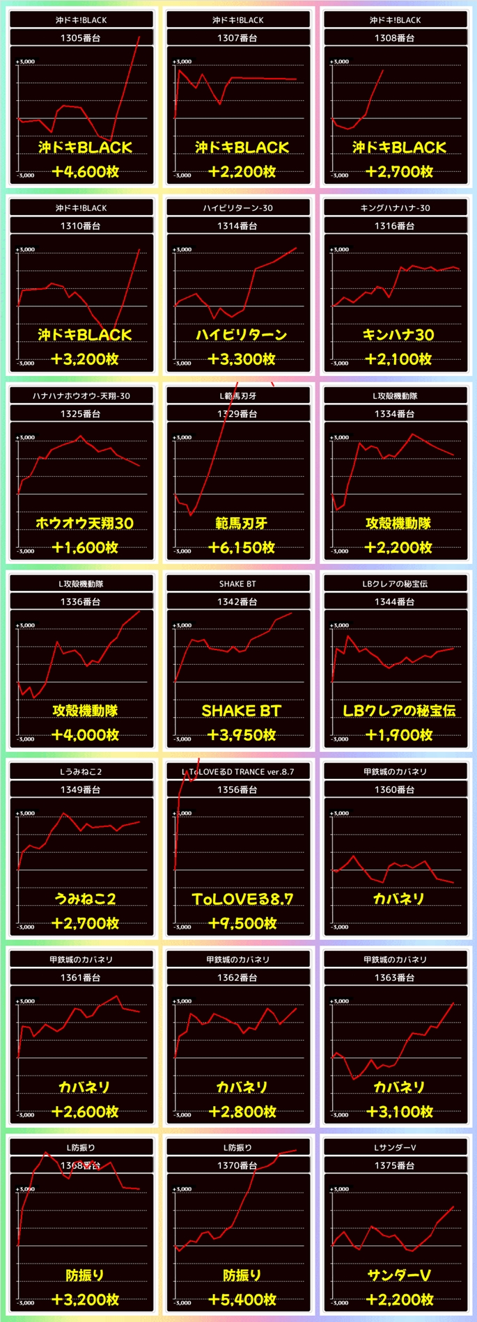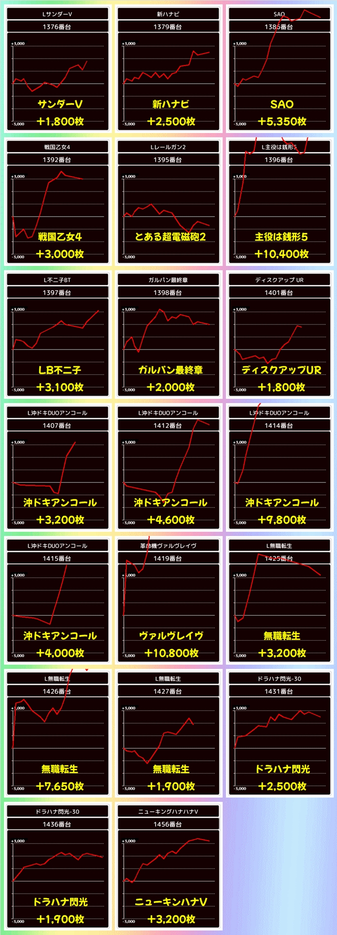 今回は1/2系濃厚の仕掛けが多数あり、その分お宝台も大量に確認することができました。いずれの機種もトータルでも好結果となりましたが、バラエティ、無職転生、防振りは平均で+2000枚を超える結果となっておりました!