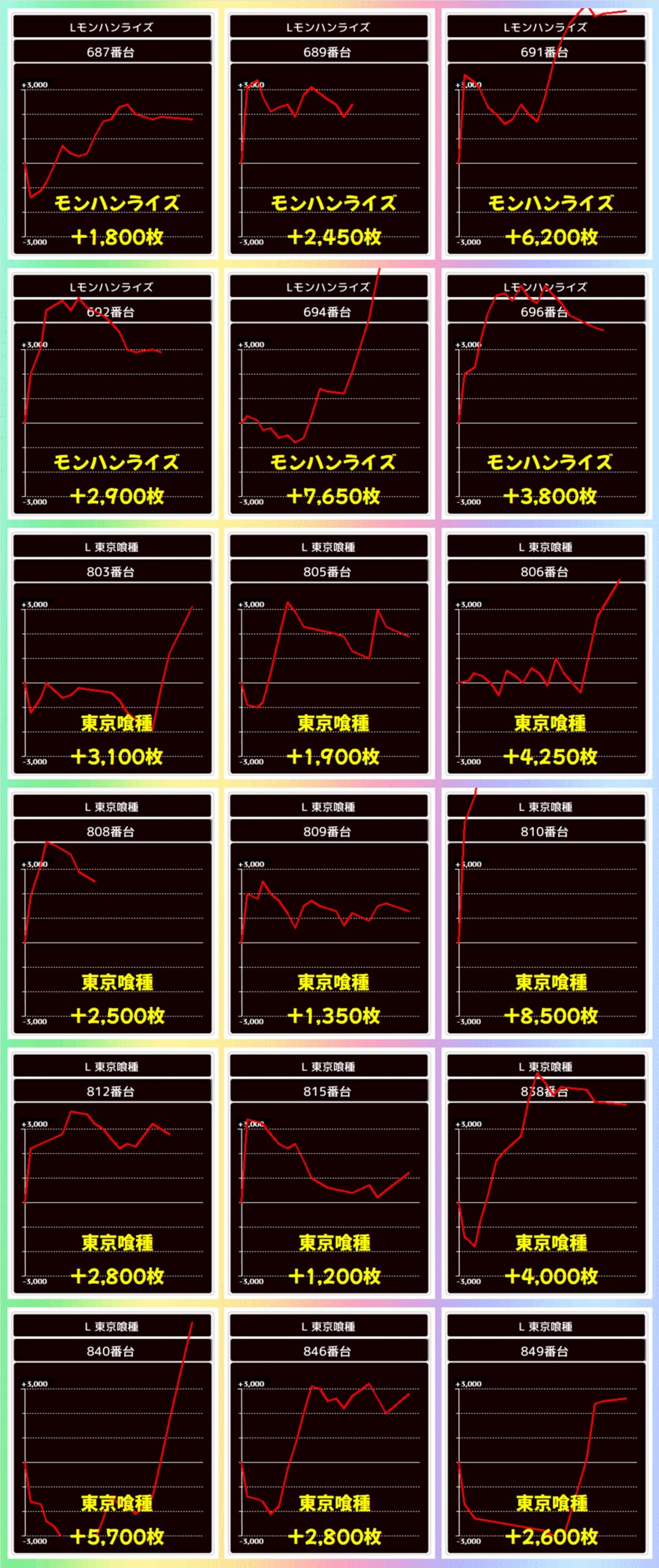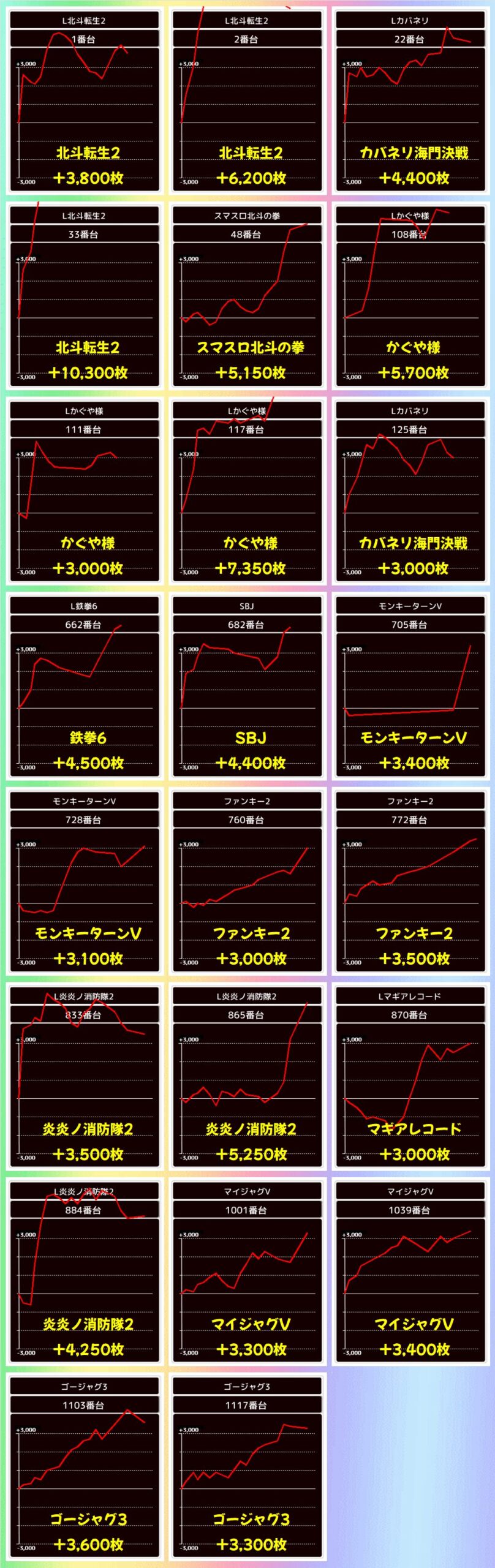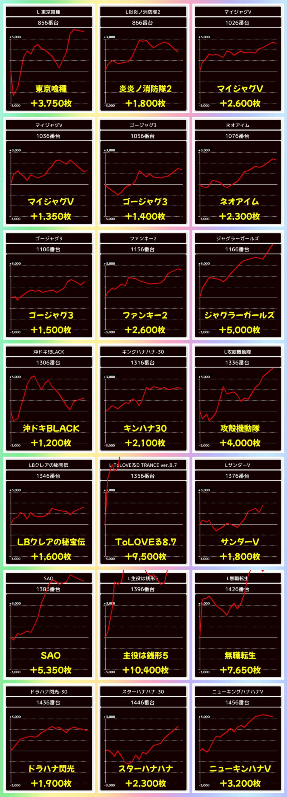今回は1/2系濃厚の仕掛けが多数あり、その分お宝台も大量に確認することができました。いずれの機種もトータルでも好結果となりましたが、バラエティ、無職転生、防振りは平均で+2000枚を超える結果となっておりました!