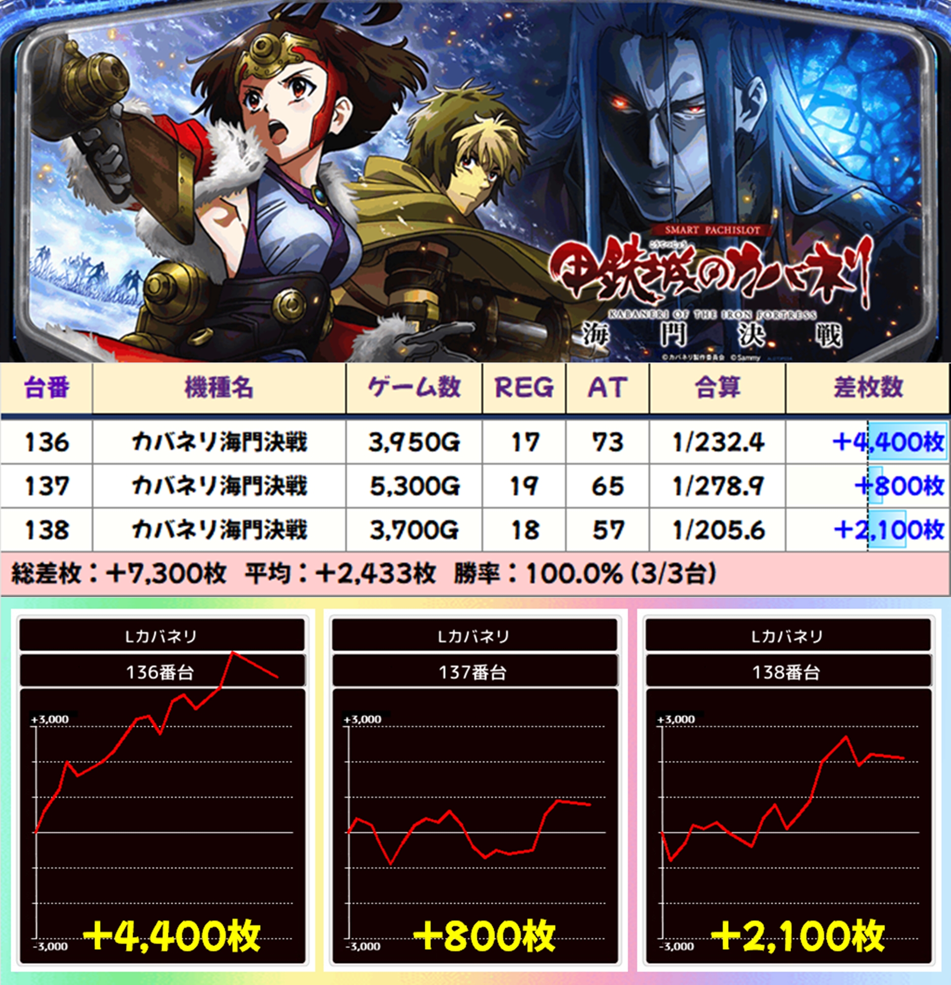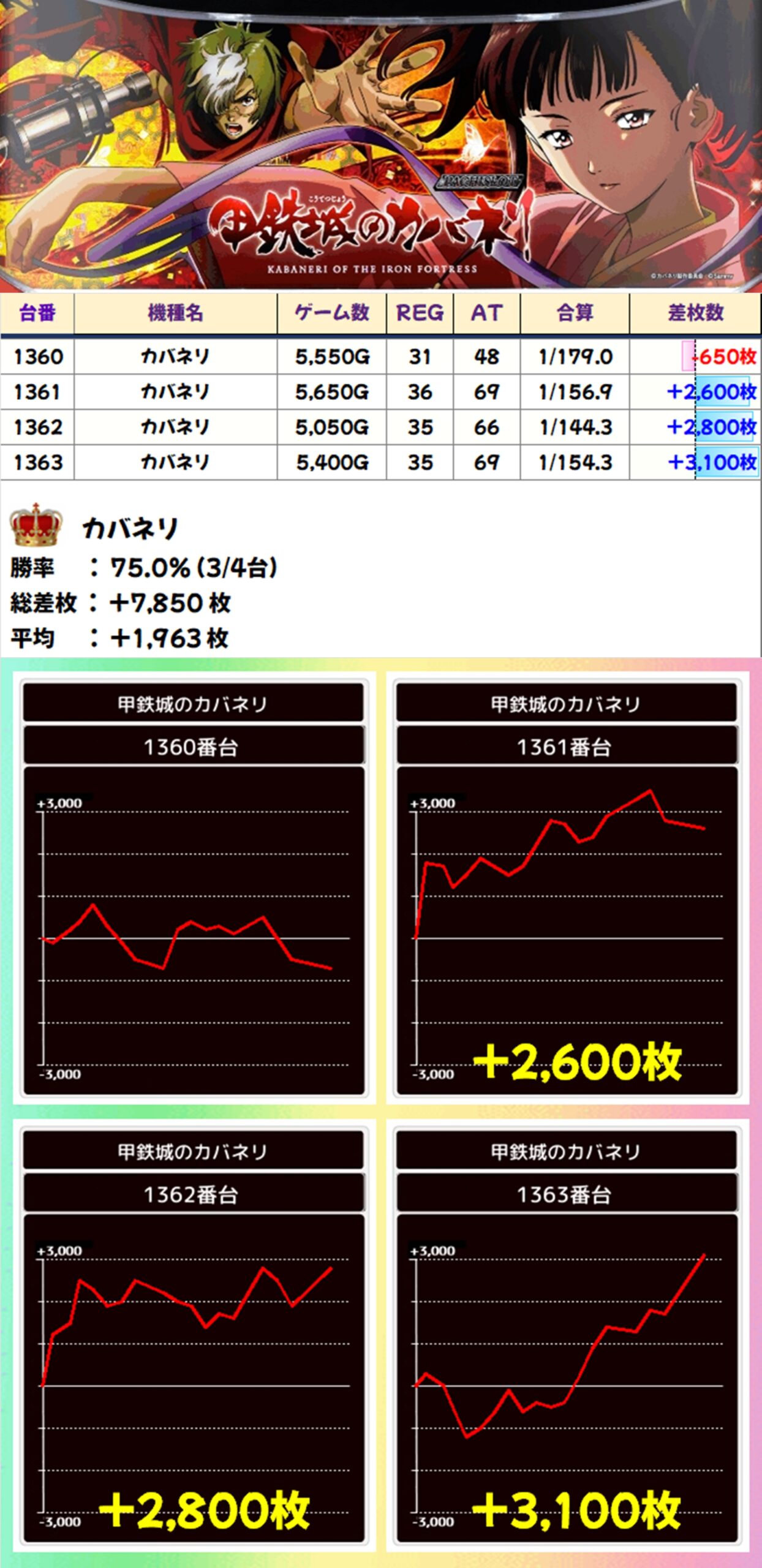 4台のカバネリは1台が不発だったものの、残りの3台はいずれも優秀な出玉を獲得!平均では+2000枚弱の結果を残しました!