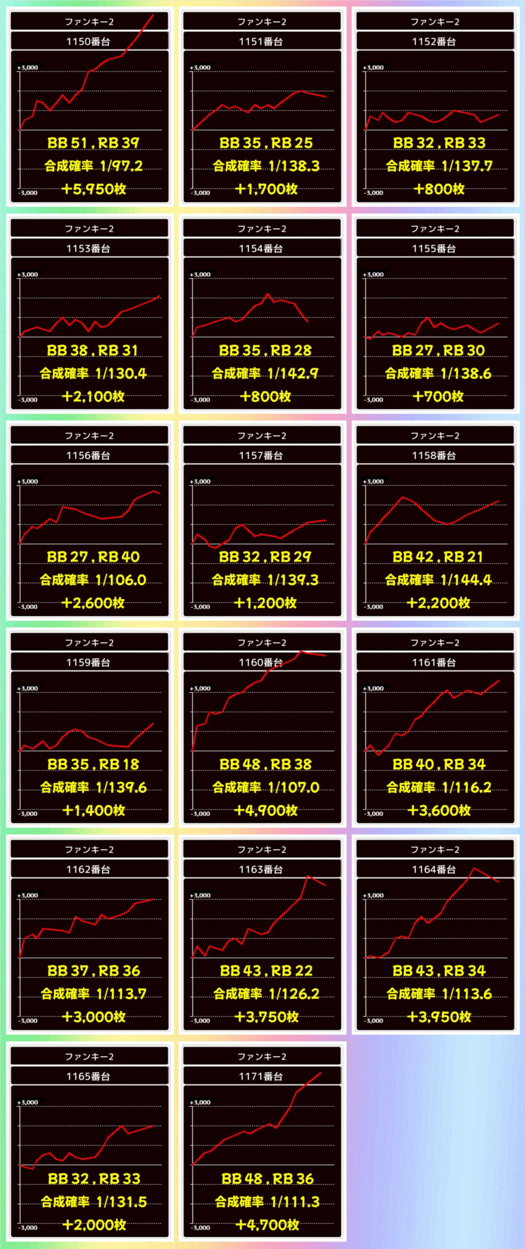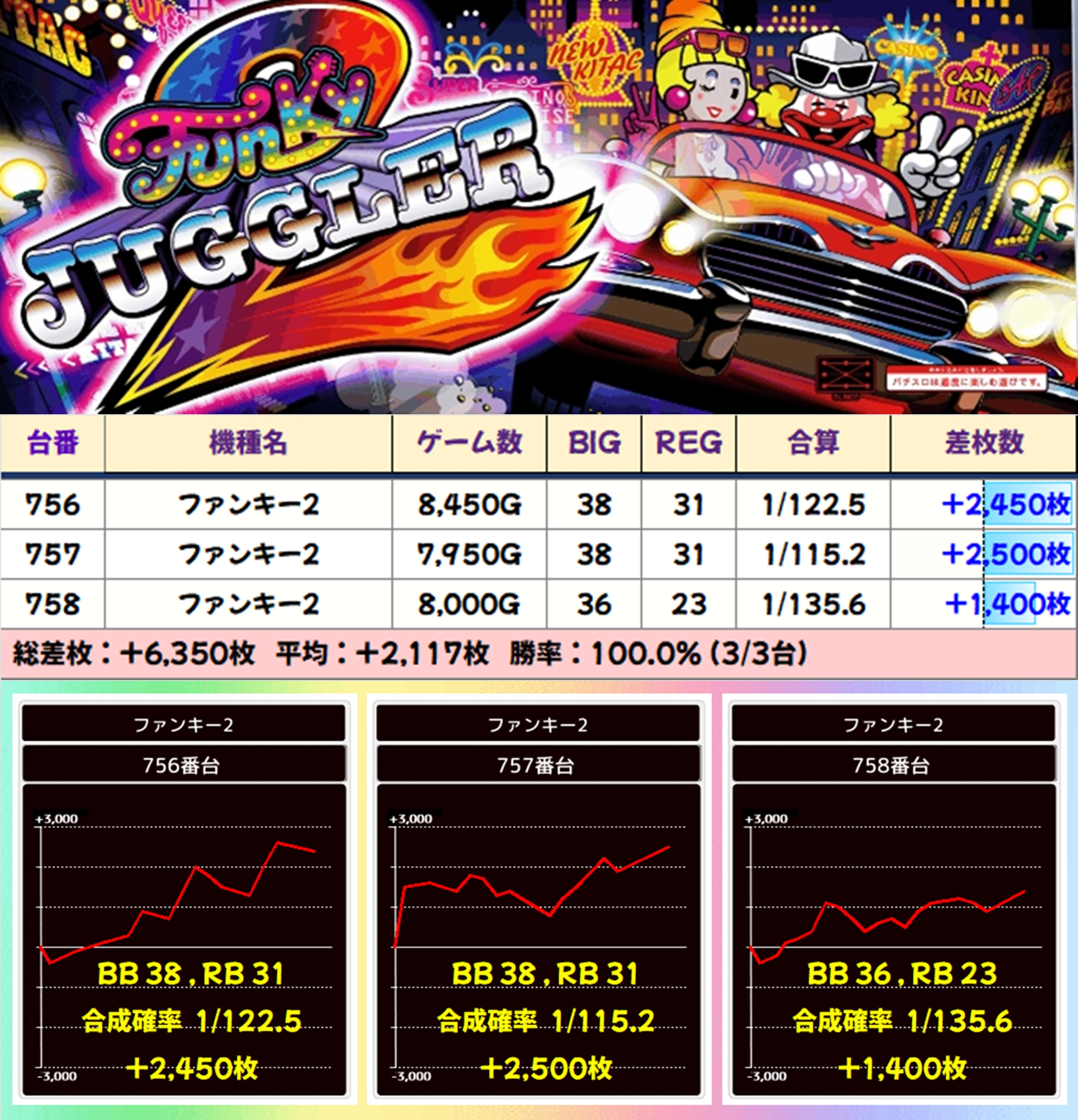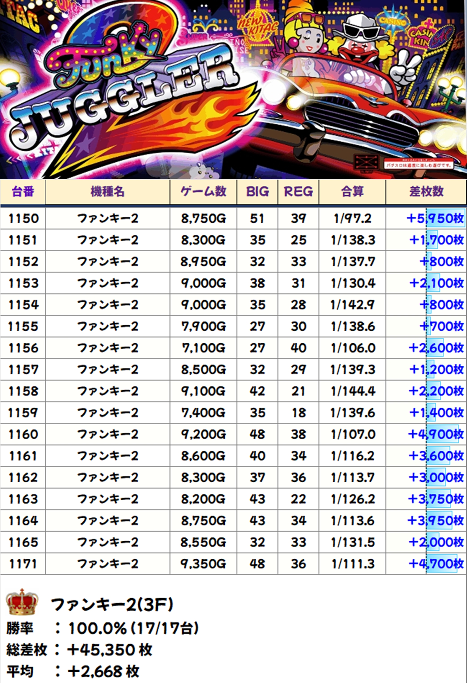 3Fのファンキー2は全台がプラスとなり、平均+2668枚と優秀な結果に。全台が打ち込みバッチリで+5950枚の爆発台も確認できました!