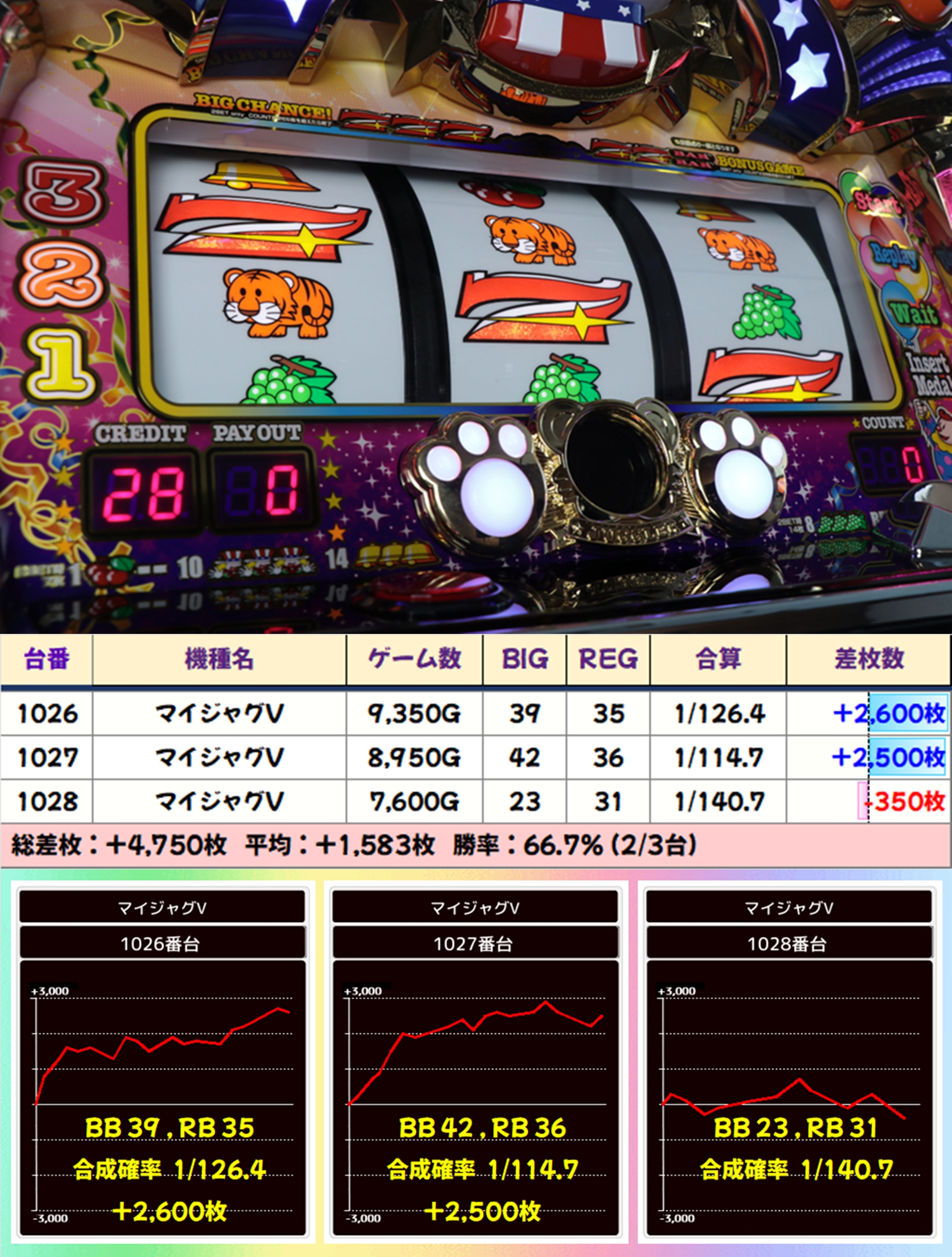 【3台並び】マイジャグV(1026-1028番台)→平均+1,583枚