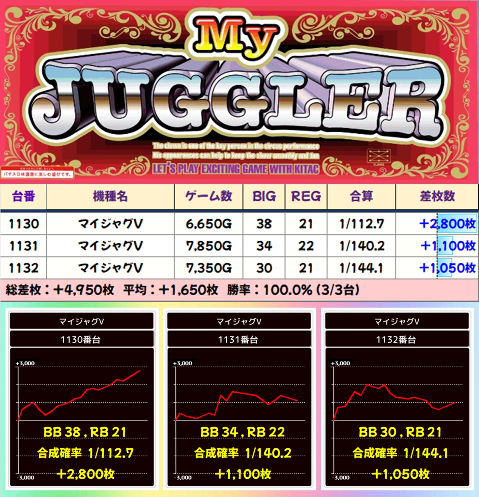 【3台並び】マイジャグV(1130-1132番台)→平均+1,650枚