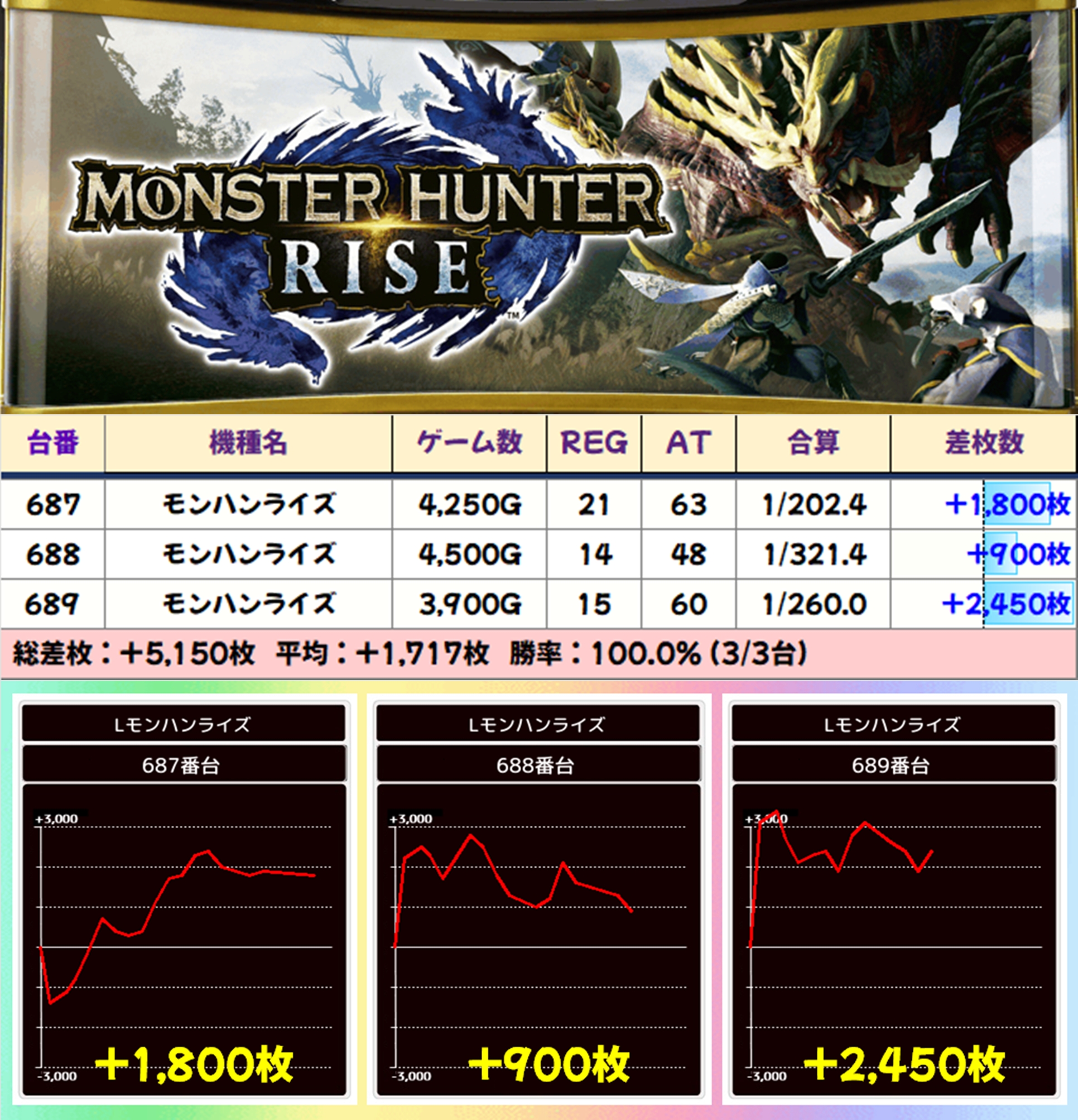 【3台並び】モンハンライズ(687-689番台)→平均+1,717枚