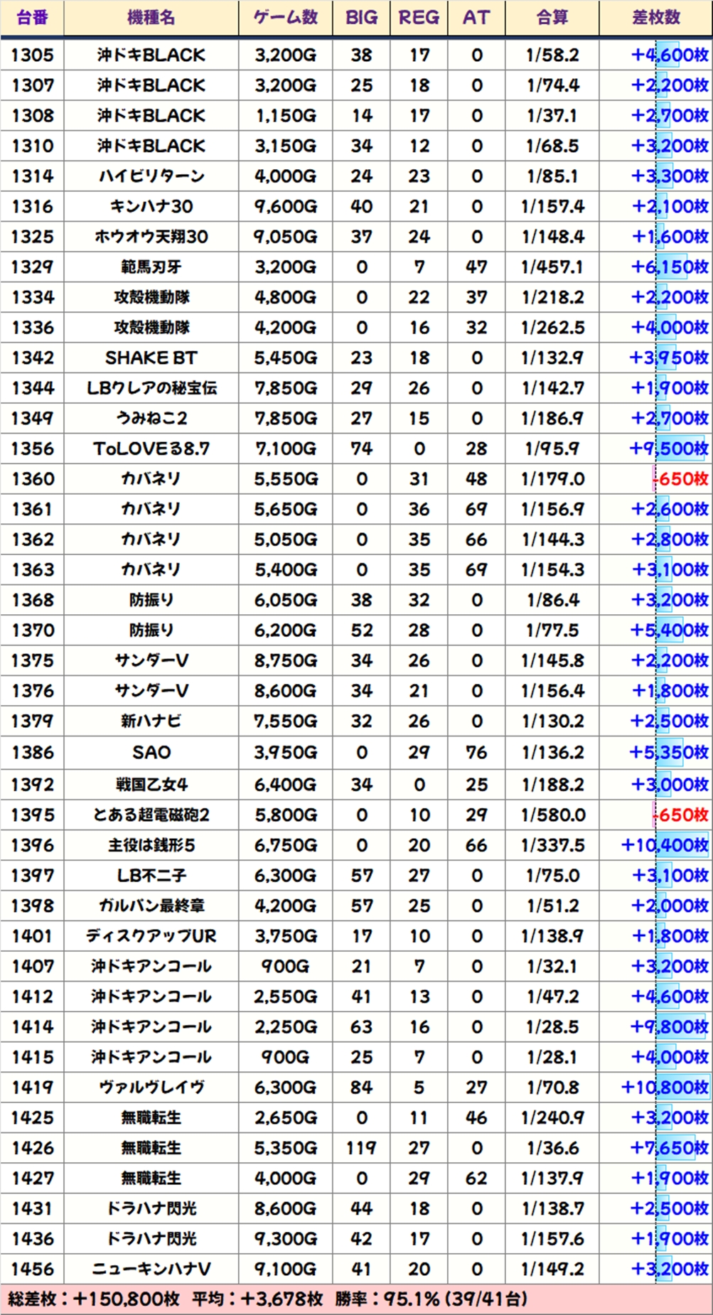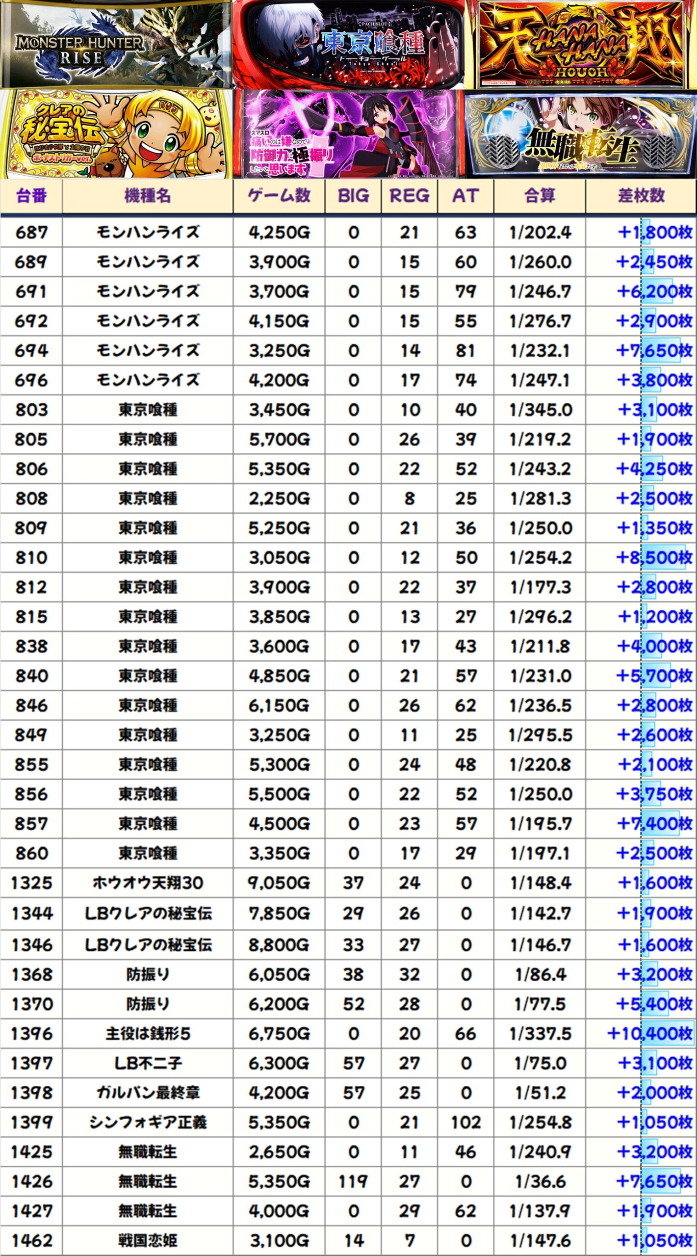 1/2系濃厚の仕掛けがあった、無職転生、防振り、ホウオウ天翔30、LBクレアの秘宝伝、バラエティは4Fの機種でしたが、それら以外の機種からもお宝台が多数登場。平均+3,678枚と見事な結果となりました!