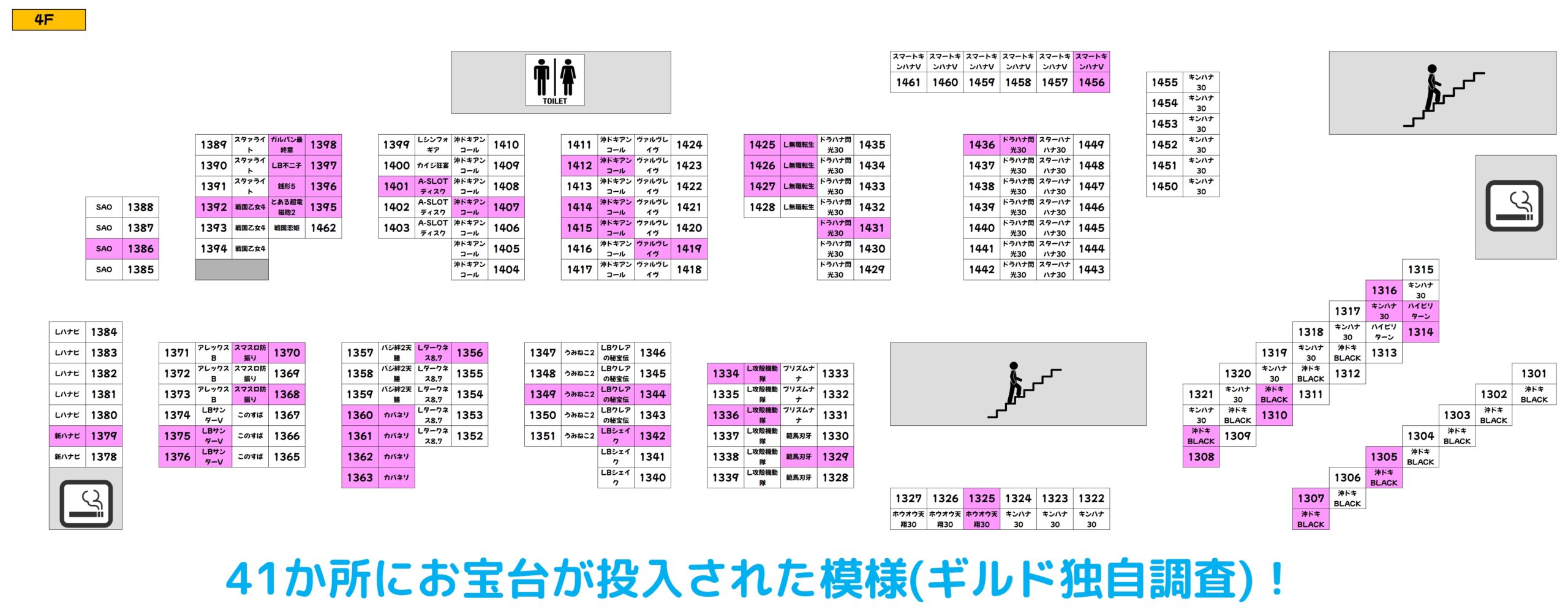 過去の傾向として27日までは対象フロアでのお宝台の大量投入に期待できますので、明日以降は積極的に4Fフロアを狙ってみてはいかがでしょうか。