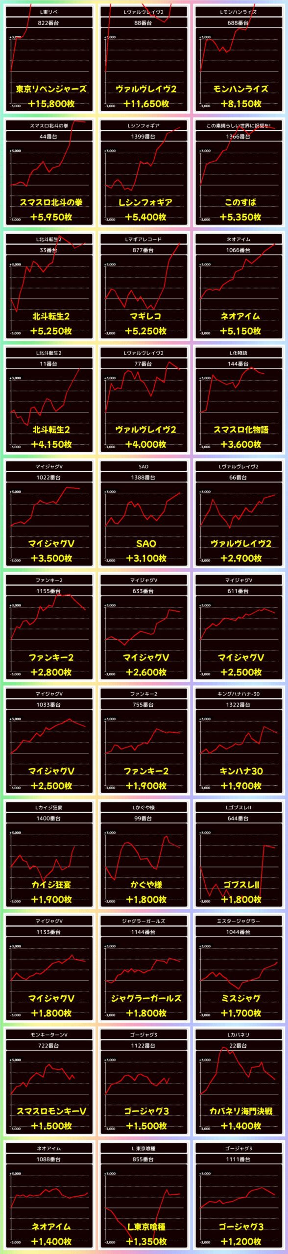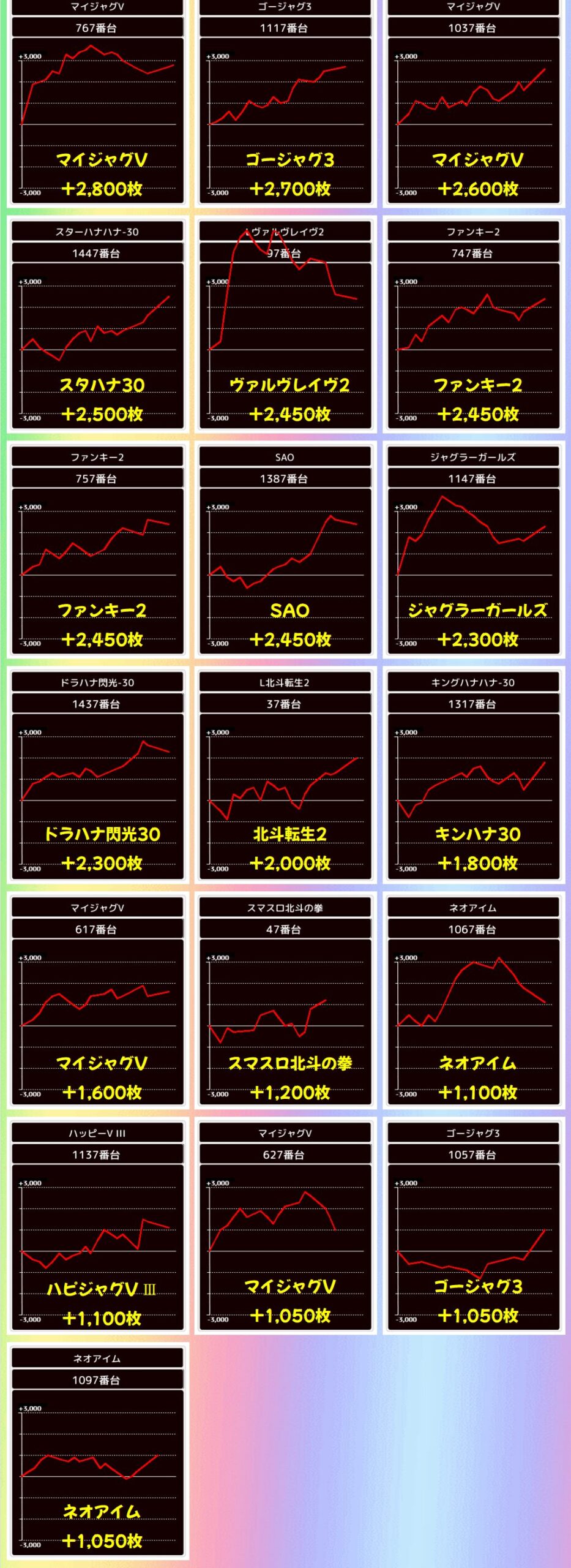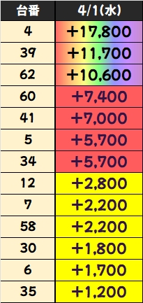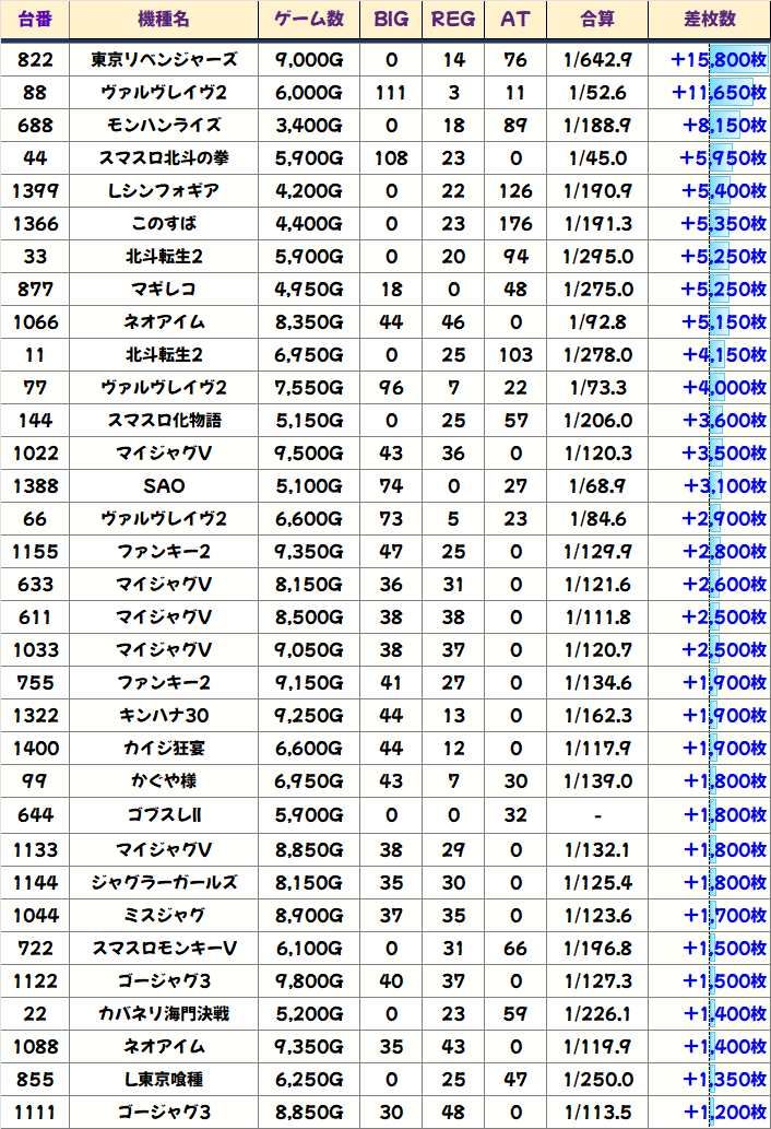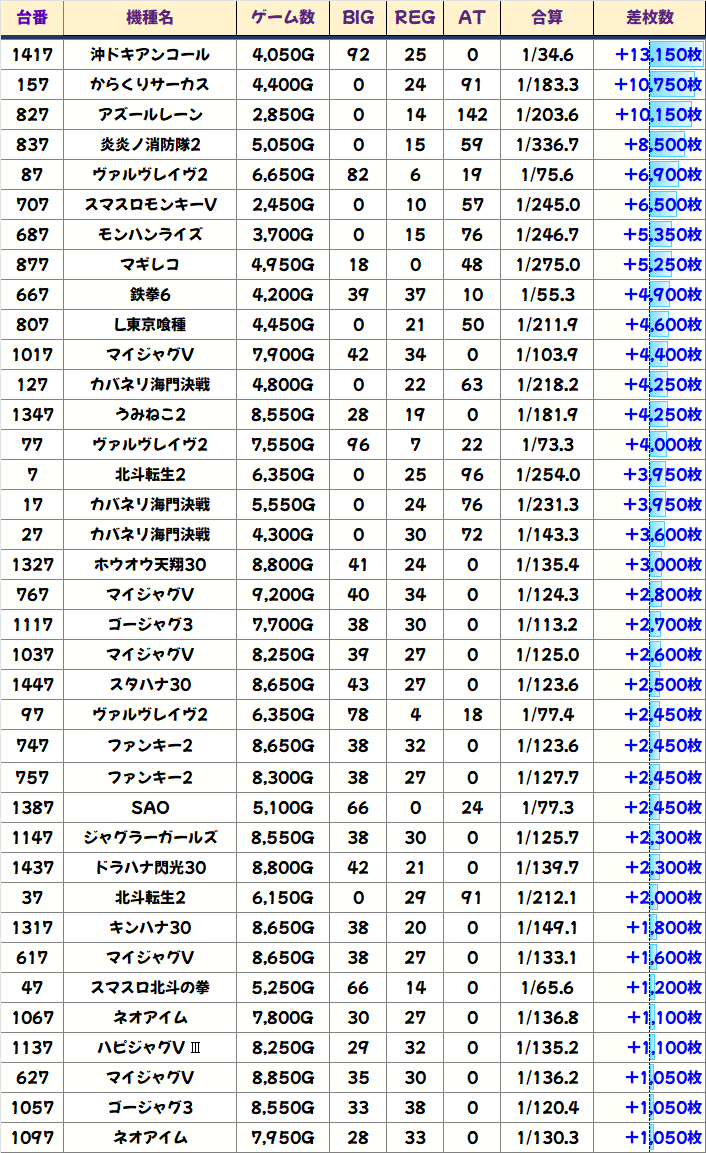 上記では+1000枚以上をピックアップしましたが、万枚3台を筆頭に約40台が+1000枚を突破と充実!