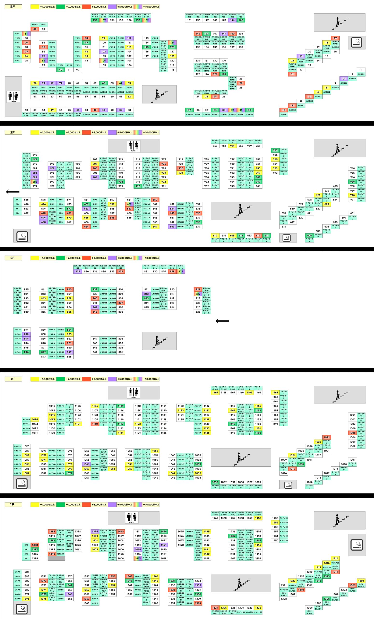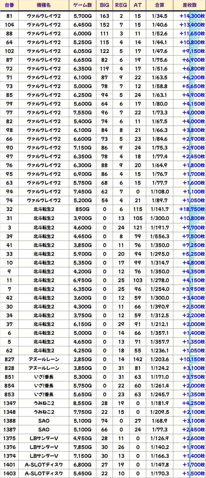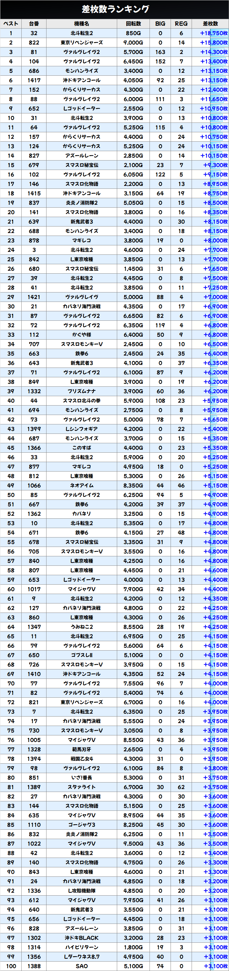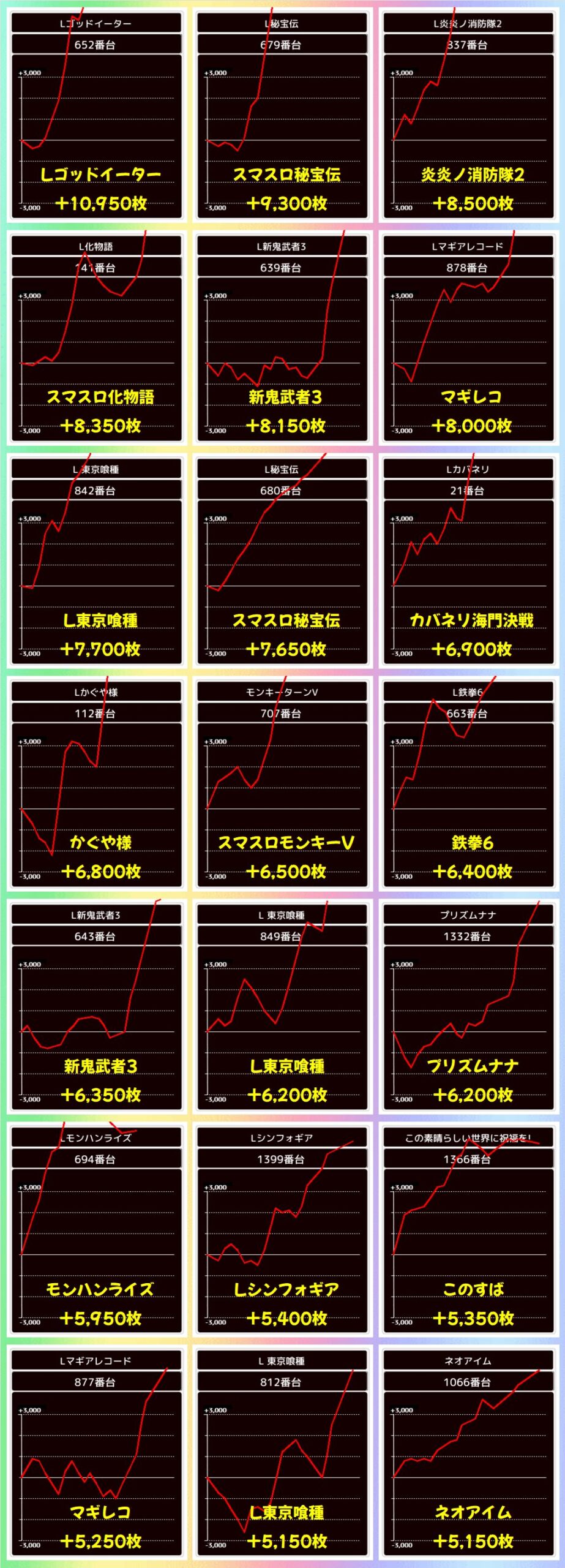 上記では+1000枚以上をピックアップしましたが、万枚3台を筆頭に約40台が+1000枚を突破と充実!