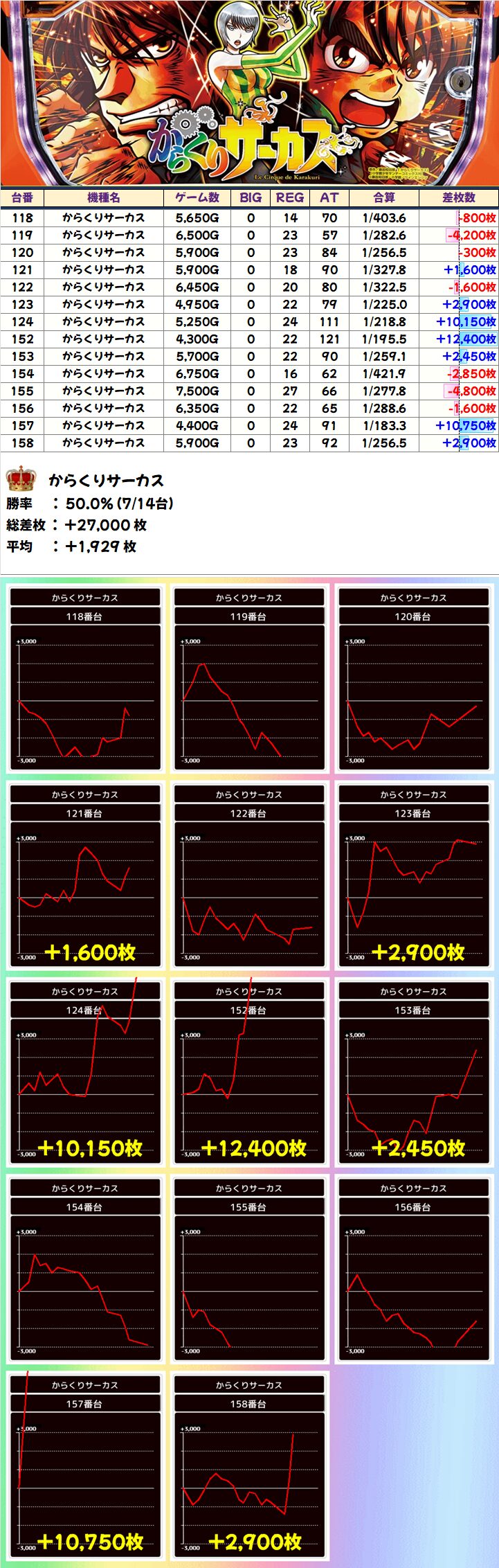 かぶぱポストにヒントがあった「からくりサーカス」は万枚オーバーが3台と大爆発!その他にも大量出玉が多数あり、不発の台もあったものの平均+2000枚クラスを記録!
