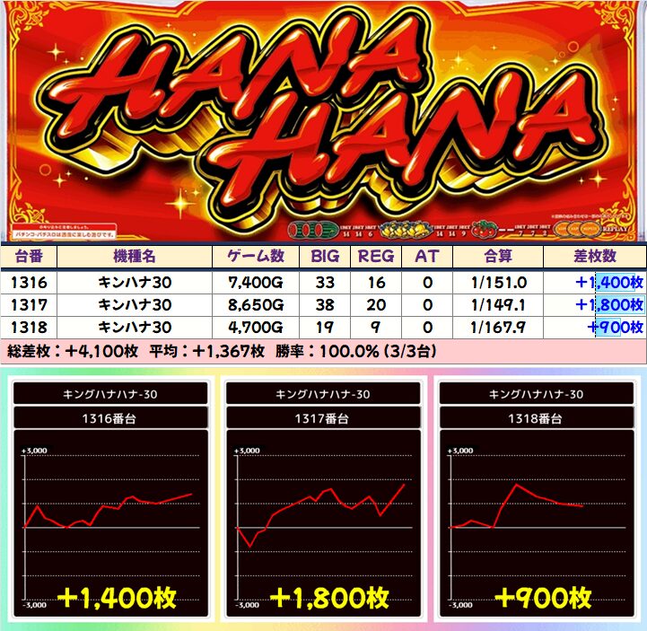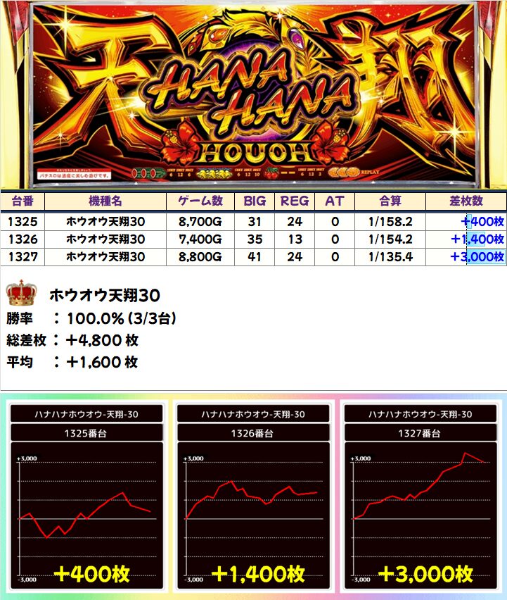 同じくかぶぱポストにヒントがあった「ホウオウ天翔30」も全台フル稼働で+3000枚以上を筆頭に全台プラス!