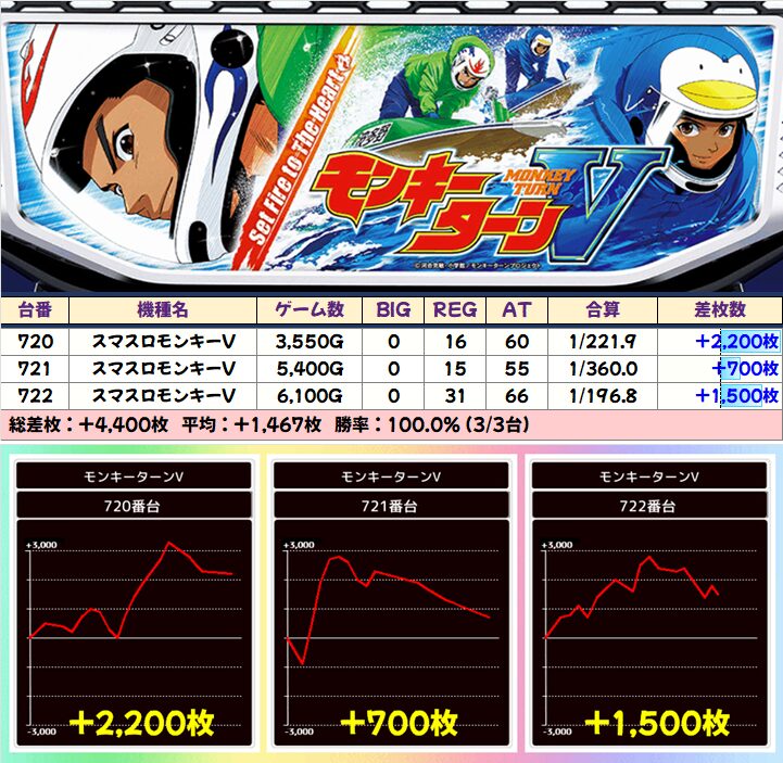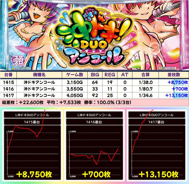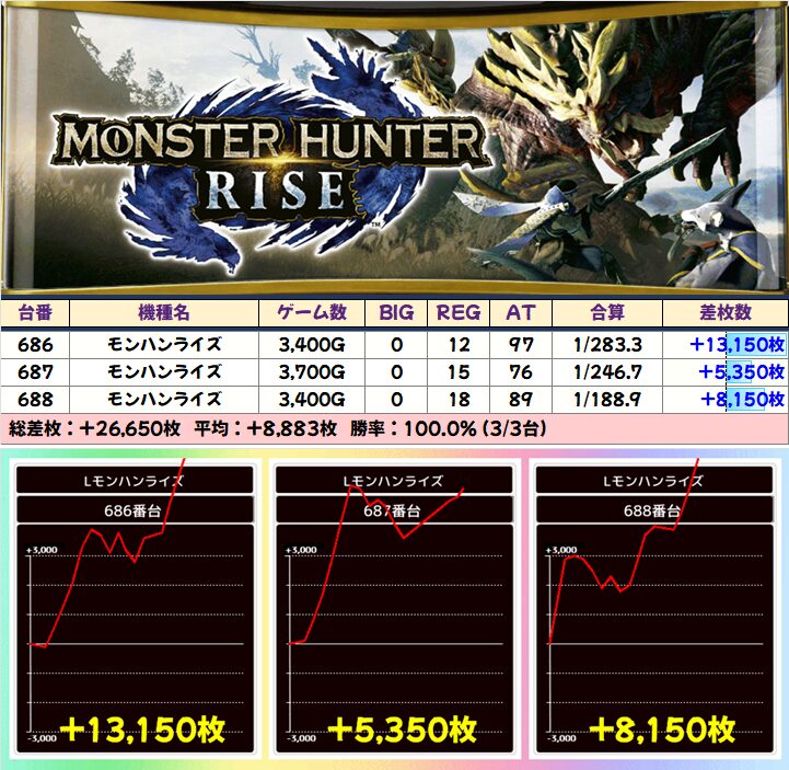 あと注目ポイントとしては「モンハンライズ」「いざ!番長」「沖ドキアンコール」から万枚が炸裂したことですね!