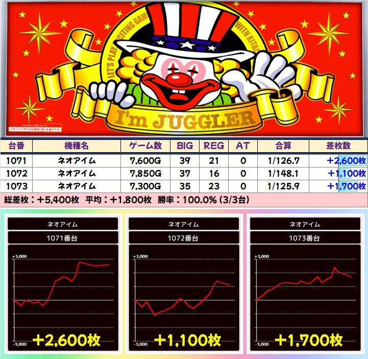 BF以外のフロアからも大量の並びを確認!定番のジャグラーシリーズからは計5箇所の並びと期待を裏切らない結果に!