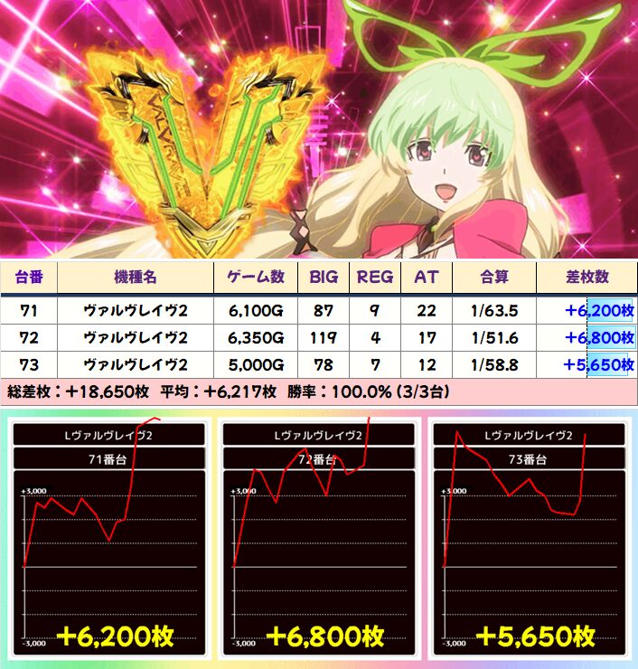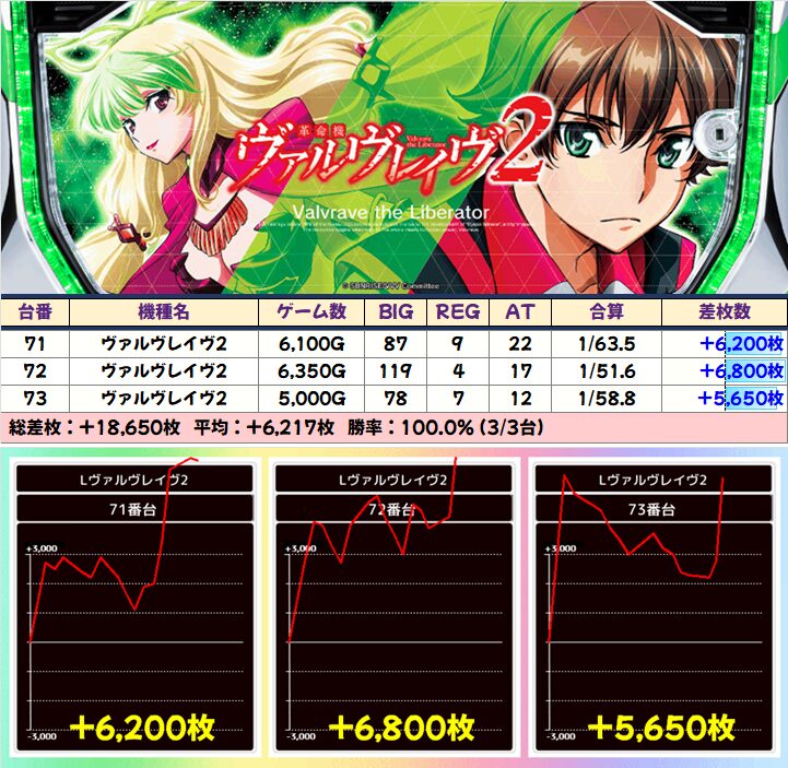 圧倒的なこの日の主役機種「ヴァルブレイブ2」は当然、初代からも+7000枚&+2500枚と素晴らしい台を確認!