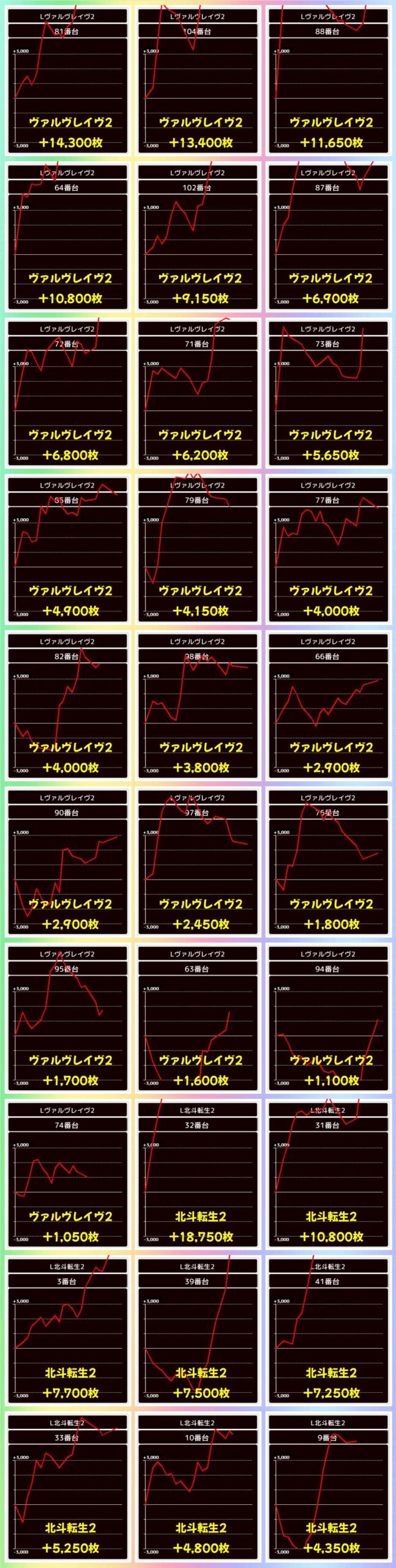 40台設置で毎日オススメ機種「ヴァルブレイブ2」、36台設置で新ポスター機種「北斗転生2」と大注目の大量設置機種が揃って仕掛け対象に!両機種ともに複数の万枚を筆頭に優秀台多数で「ヴァルブレイブ2」は総差枚+8.5万枚、「北斗転生2」は総差枚+4.2万枚と機種別でワンツーフィニッシュの出玉を叩き出していました!