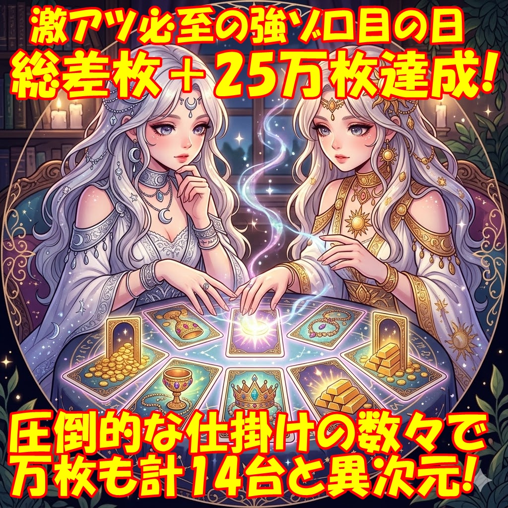 この日は王道の仕掛けに加えて、強ゾロ目の日に恒例となっている並びの仕掛けから優秀な出玉が多数出現で、平均+338枚&総差枚+25万枚と素晴らしすぎる結果に!それでは爆裂の軌跡を振り返っていきましょう!