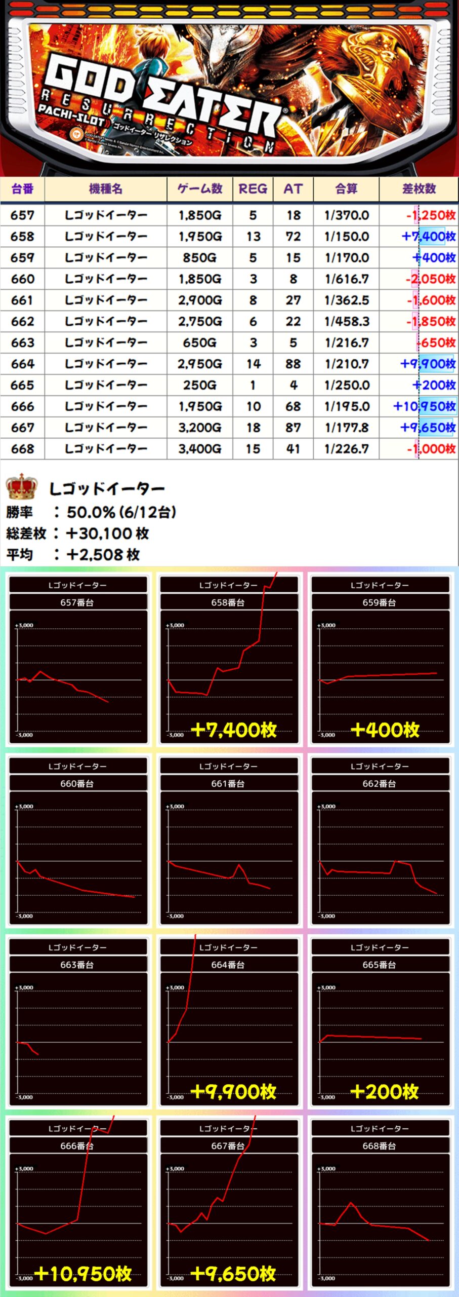 Lゴッドイーターからは+10950枚や+9900枚、+9650枚、+7400枚とった爆発台を複数確認。打ち込み不足で不発の台もありましたが、出た台はしっかり大量出玉となりました。