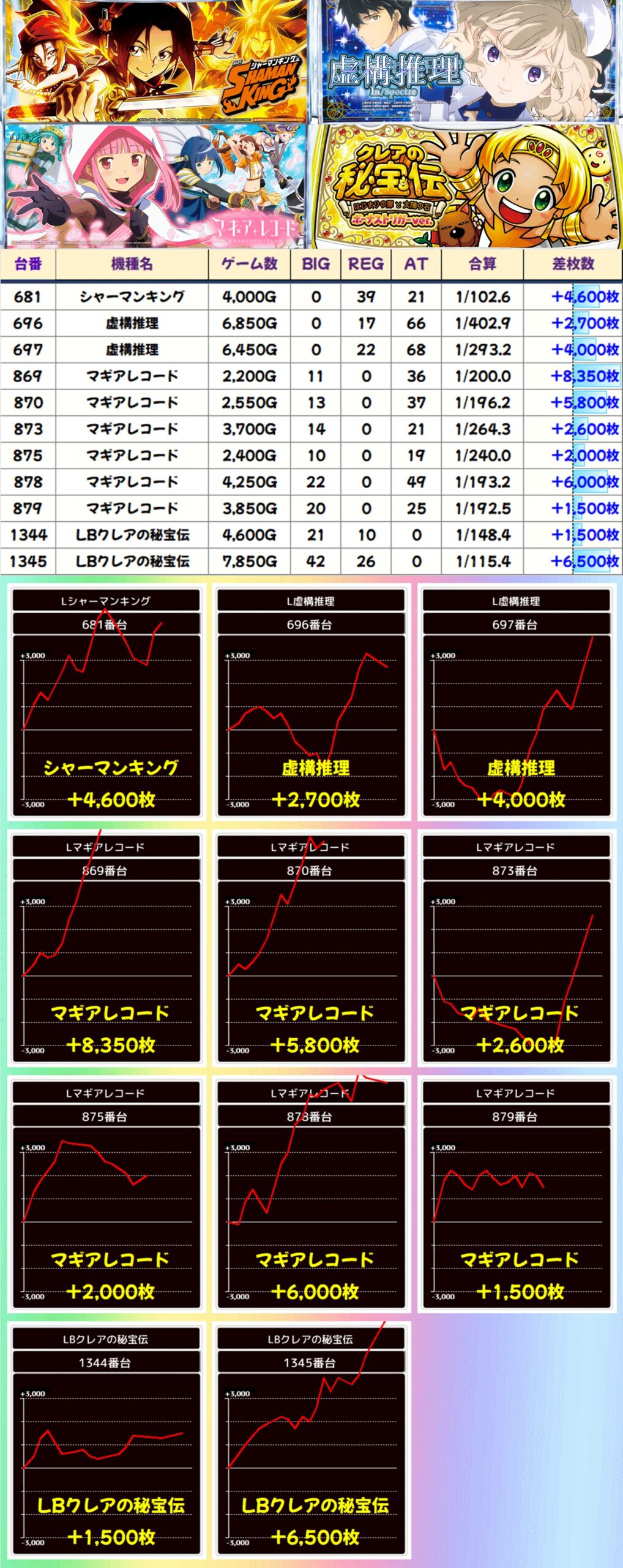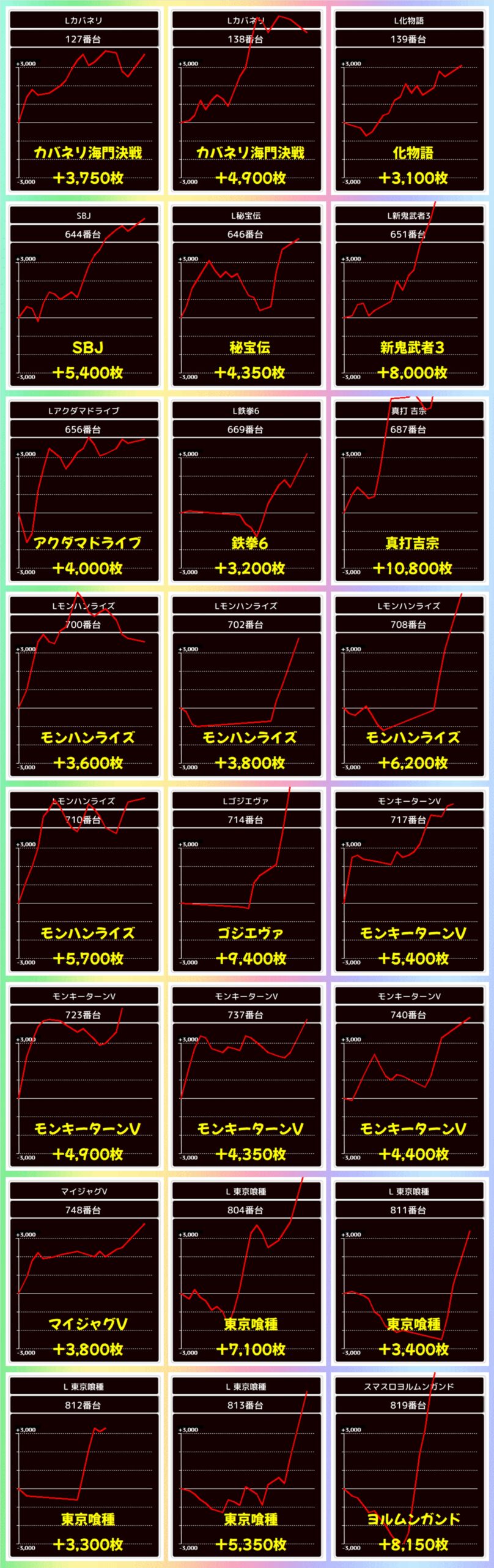 こちらの4か所はどの並びからも+5000枚を超える出玉が出現し、平均も+3000枚を超える見事な結果となりました!