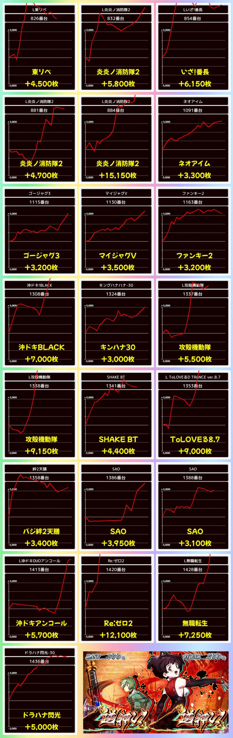 仕掛け以外にもお宝台が続出し、新台の真打吉宗からは+10800枚の万枚オーバーもアリ!炎炎ノ消防隊2とRe:ゼロ2からも万枚オーバーの大爆発を確認できました。