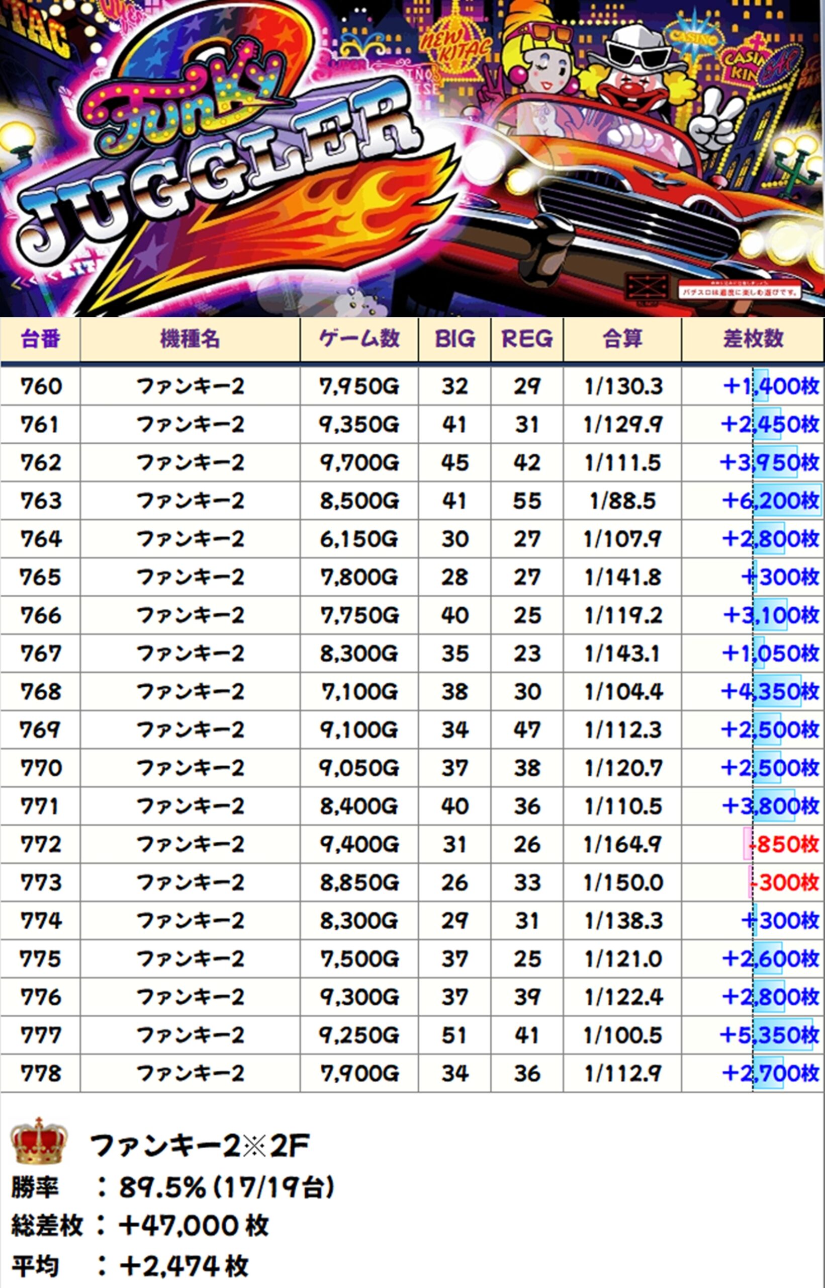 ファンキー2※2F(17/19台+)→平均+2,474枚