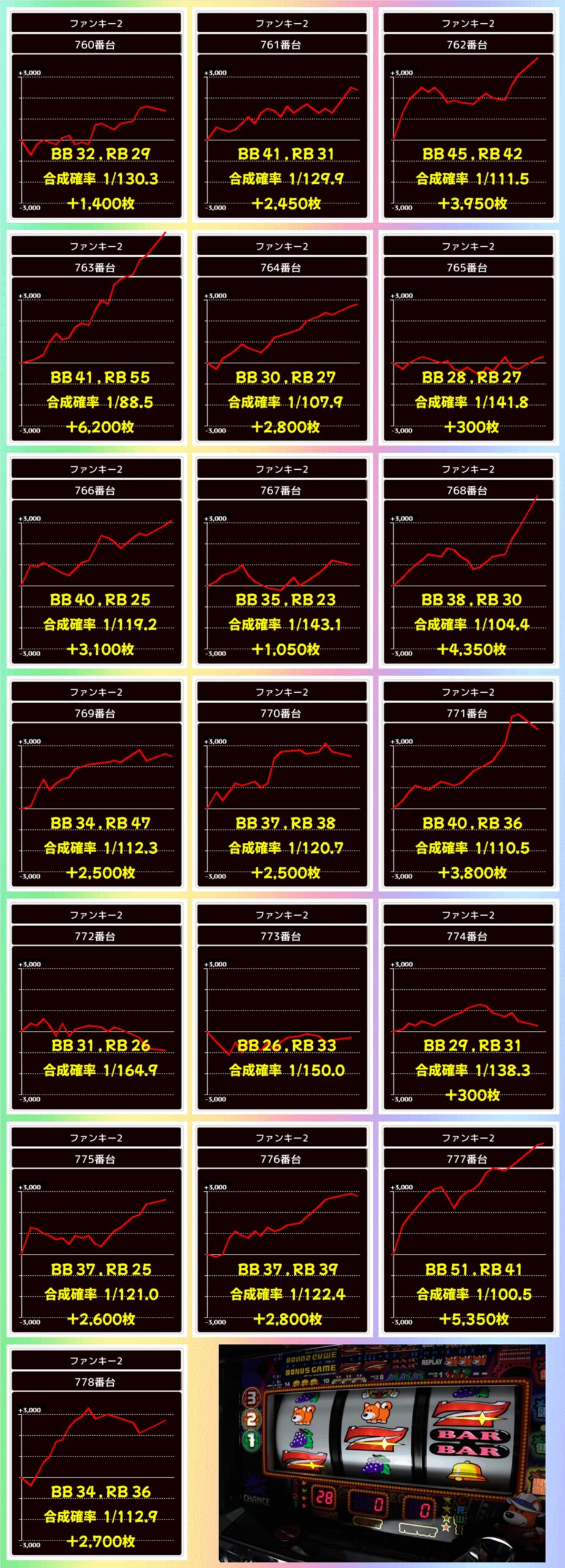 2Fのファンキー2の19台はほとんどの台がプラスとなり、打ち込みも抜群!+6200枚や+5350枚の大量出玉も確認でき、平均+2474枚の好成績となりました!