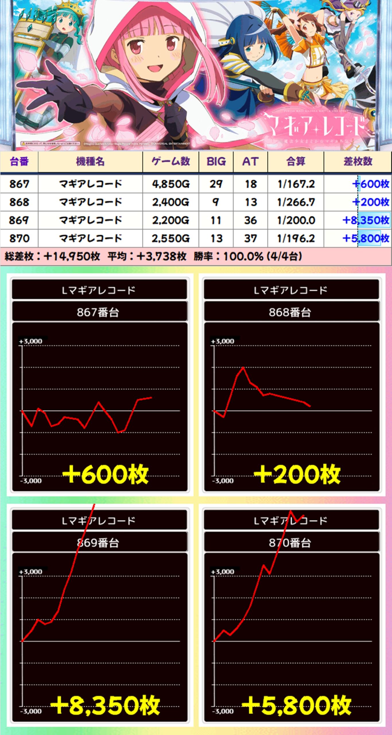 【4台並び】マギアレコード(867-870番台)→平均+3,738枚