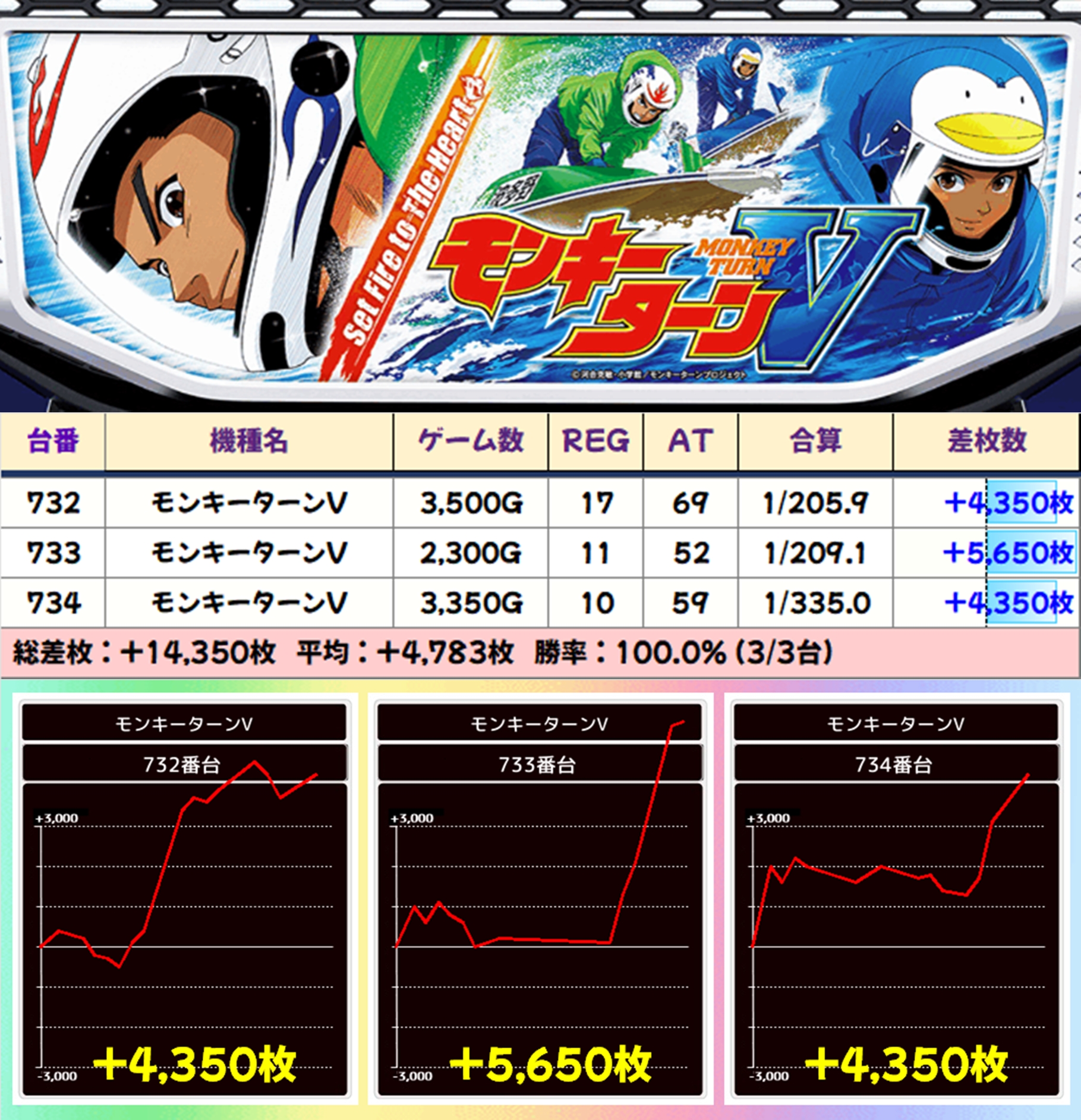 【3台並び】モンキーターンV(732-734番台)→平均+4,783枚