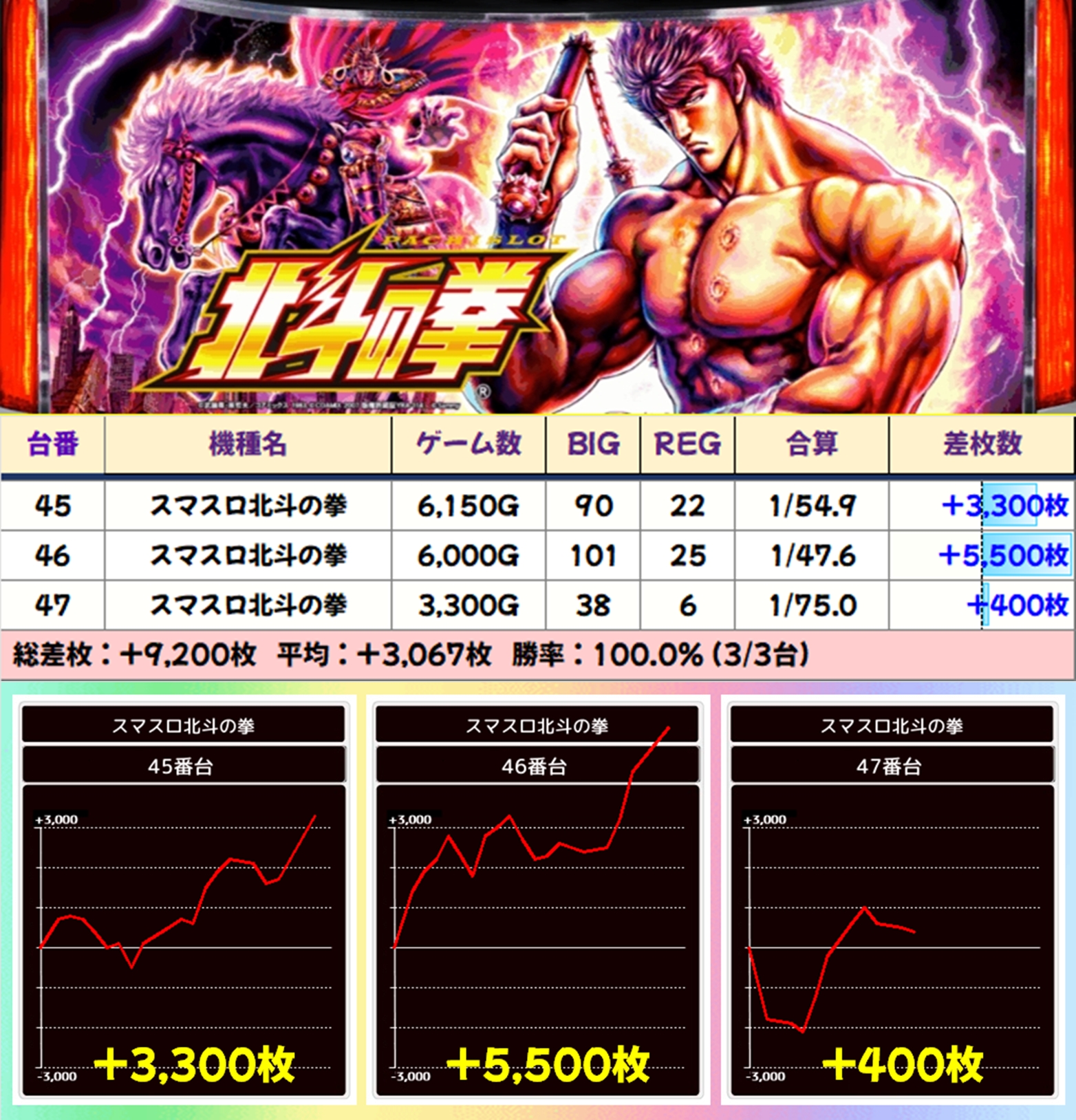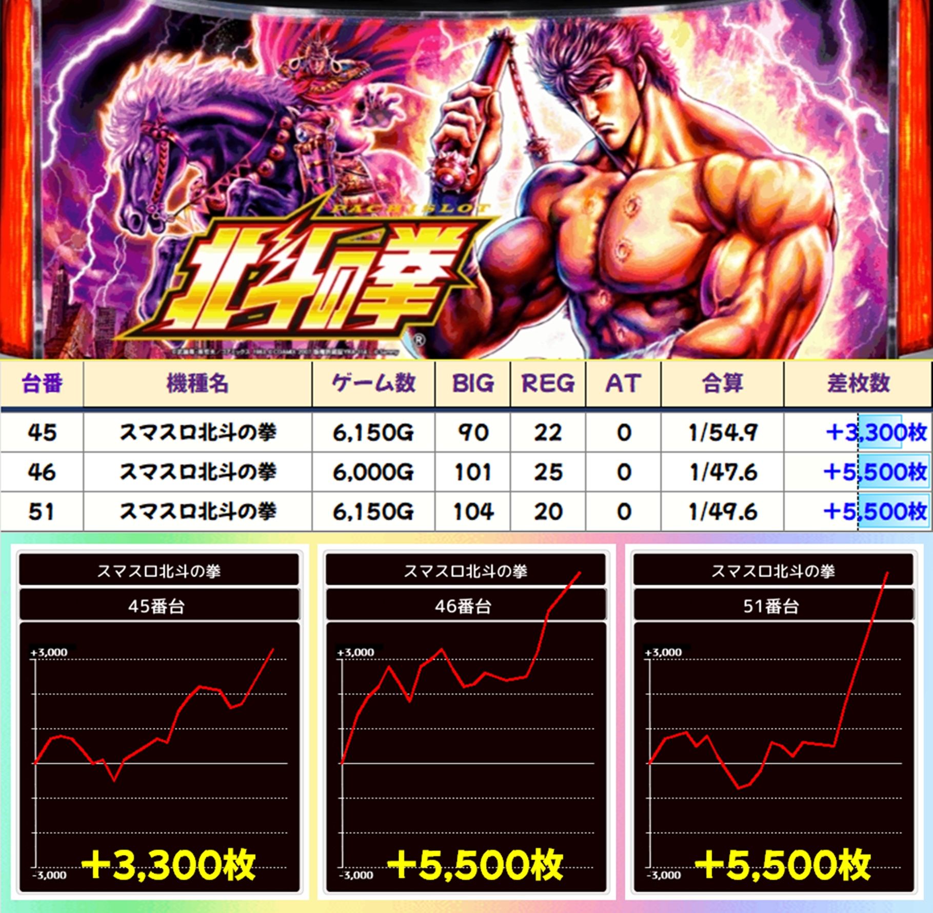 【3台並び】スマスロ北斗の拳(45-47番台)→平均+3,067枚