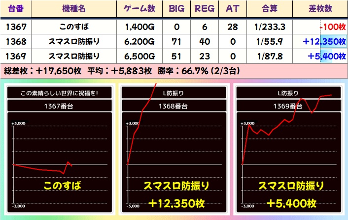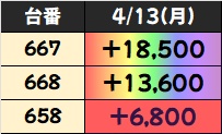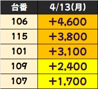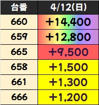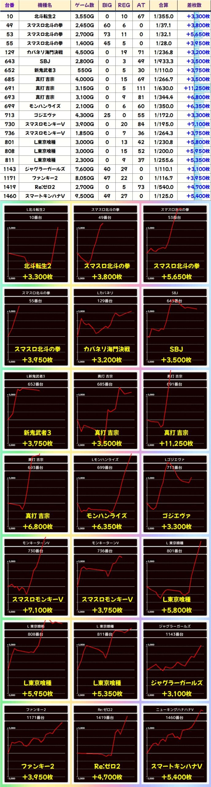 新台系やハナハナ、天膳が1/2系で半数以上がプラス差枚でした!スマスロの爆裂台は多くが一撃で大量獲得!