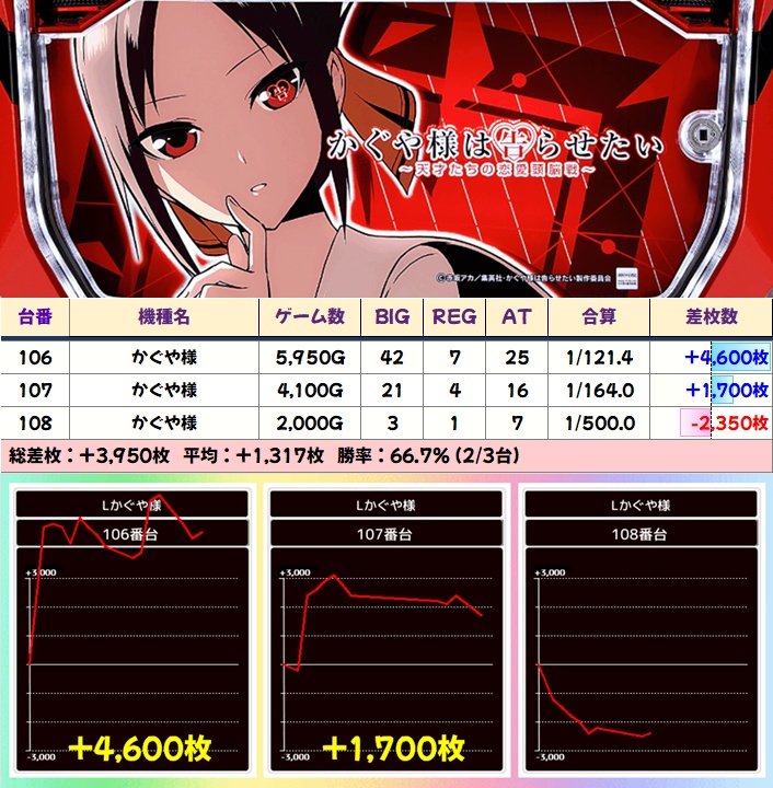 かぐや様は1000枚超が5台、主に並びに絡んだ台が優秀でした!