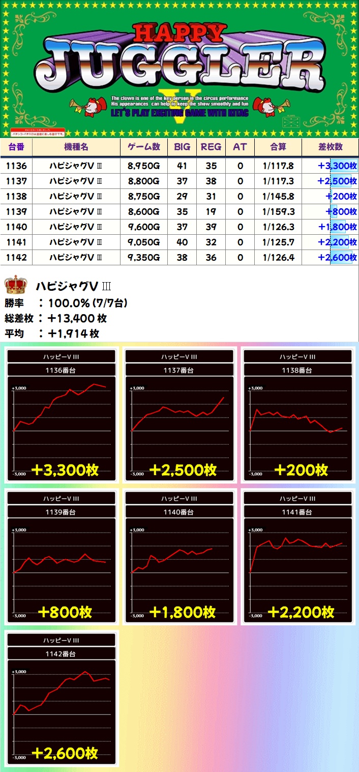 ハピジャグ(7/7台+)➡平均+1,914枚
