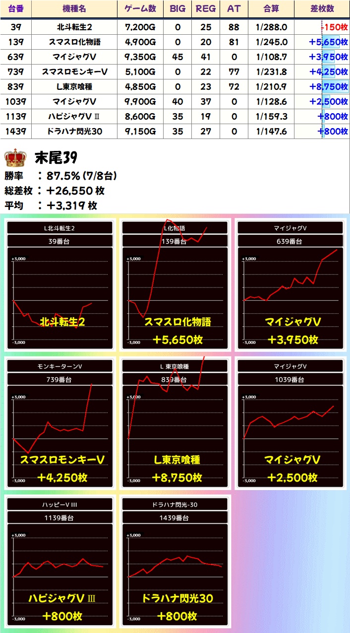 39の日に良番であれば迷わず狙いたい末尾39。東京喰種や化物語は5000枚超を獲得し、それ以外にも多くの台が1000枚クラスを持ち帰りました!