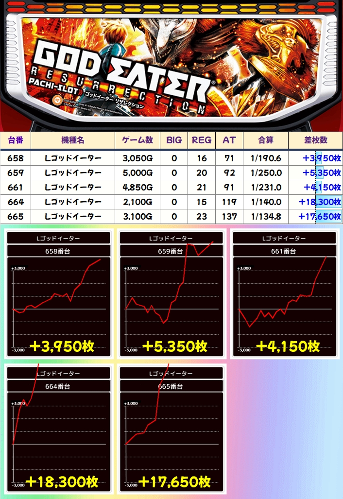 ゴッドイーターからは+18000枚overと+17000枚overのコンプリート級の出玉が飛び出しており、機種全体では平均+3300枚overを記録。