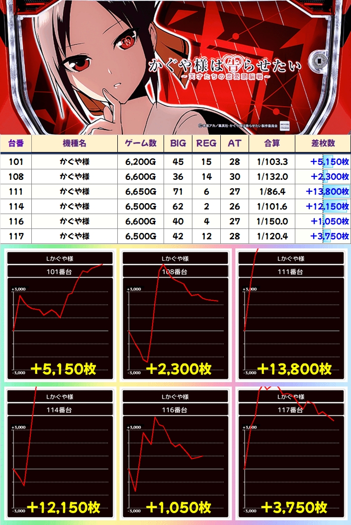 今回は新ポスター登場中のかぐや様が1/2系の対象になっていたようで、万枚オーバーが2台出現!