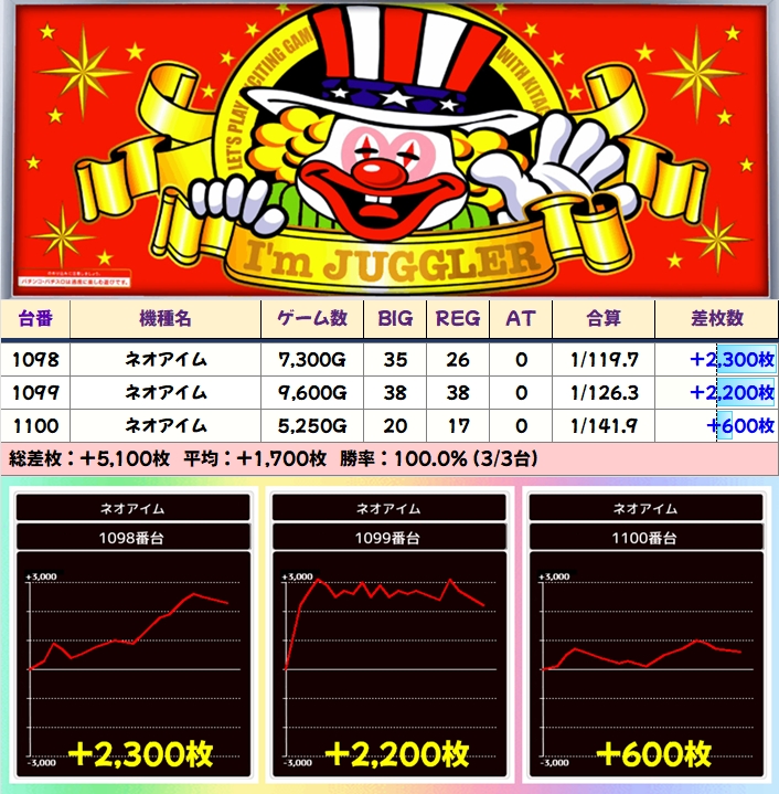 【3台並び】ネオアイム(1098番台〜1100番台)→平均+1,700枚(3/3台+)
