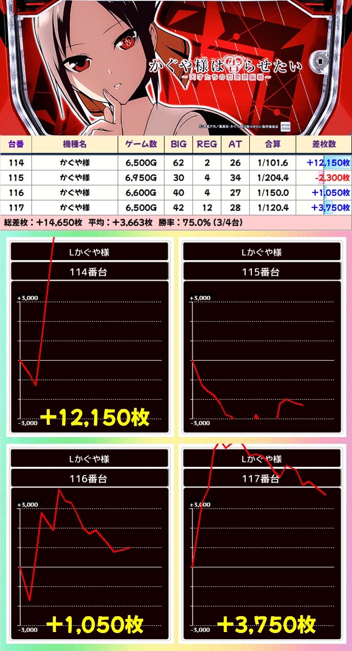 【4台並び】かぐや様(114番台〜117番台)→平均+3,663枚(3/4台+)