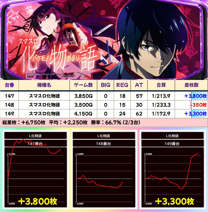 【3台並び】スマスロ化物語(147番台〜149番台)→平均+2,250枚(2/3台+)