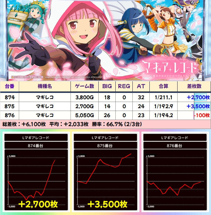 【3台並び】マギレコ(874番台〜876番台)→平均+2,033枚(2/3台+)