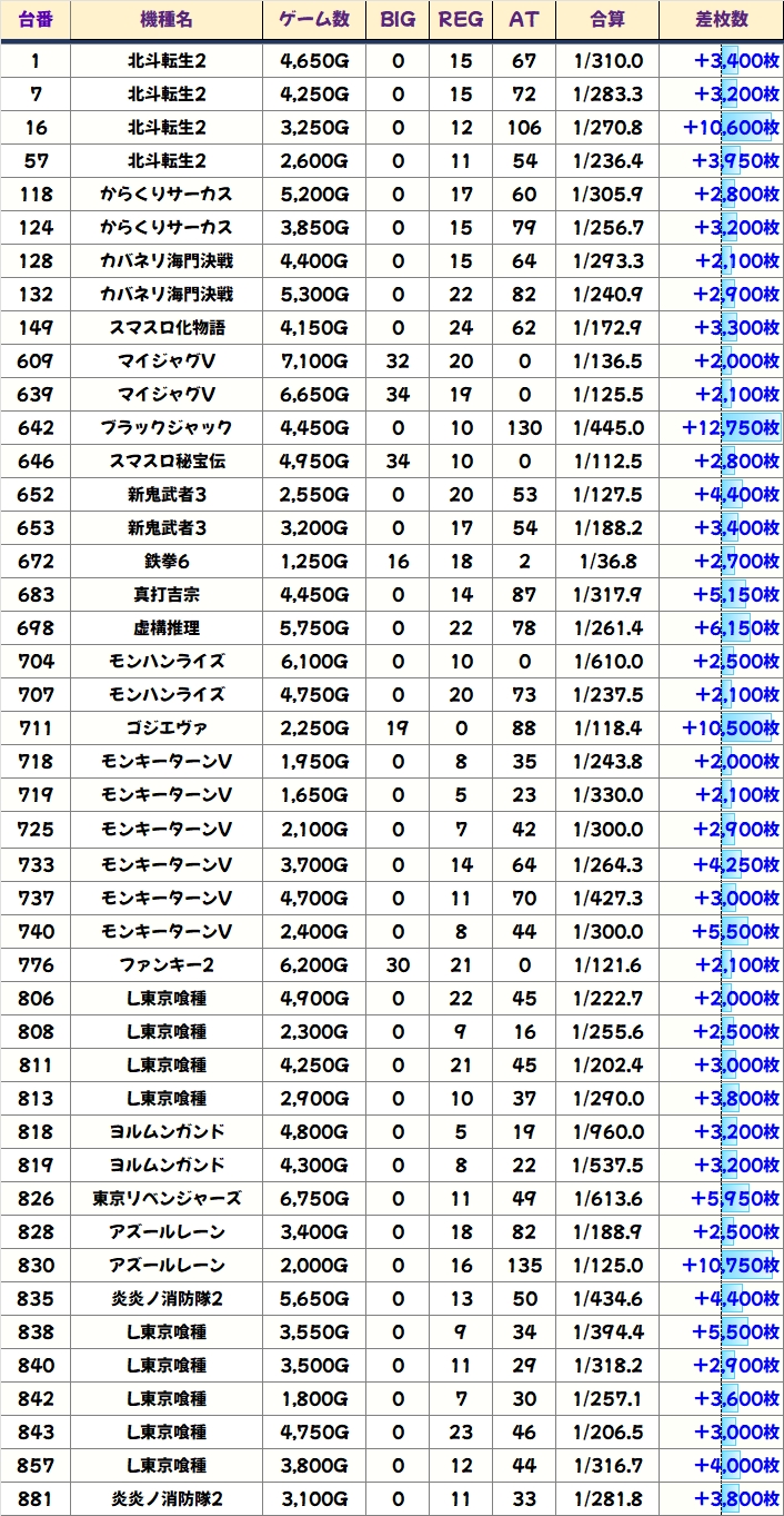 各機種の優秀台をピックアップしますので、データをチェックしていきましょう。