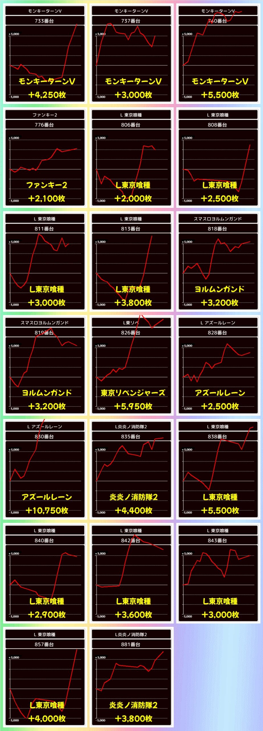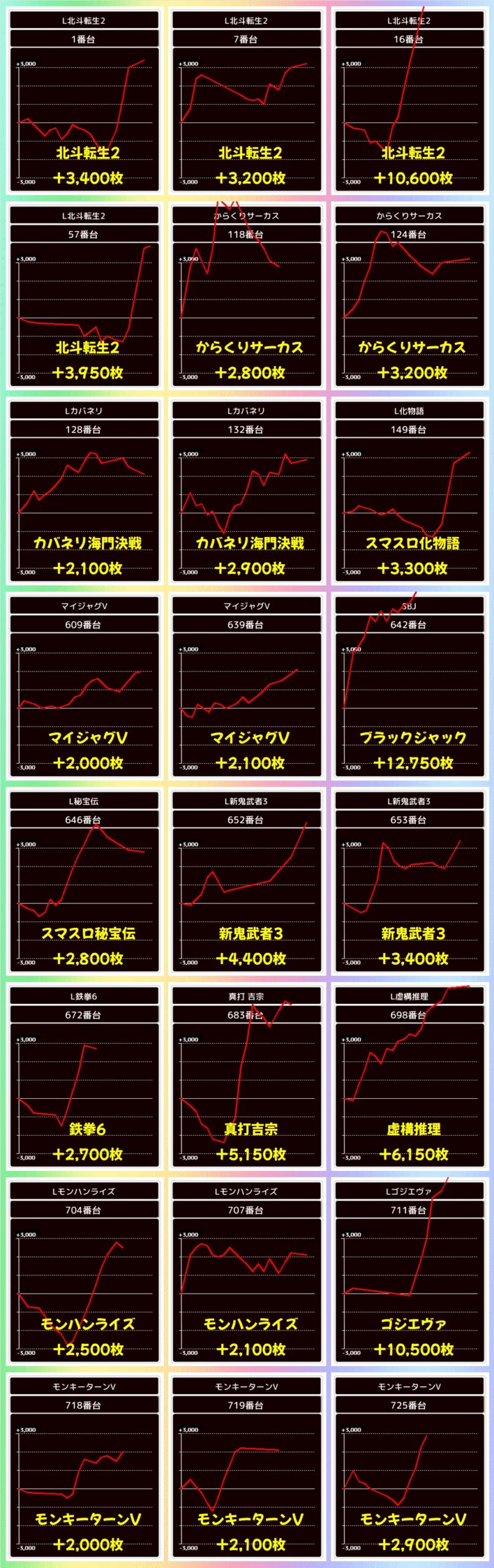 万枚オーバーの爆出し台も複数確認でき、プリズムナナからは+16250枚の爆裂台も確認することができました!